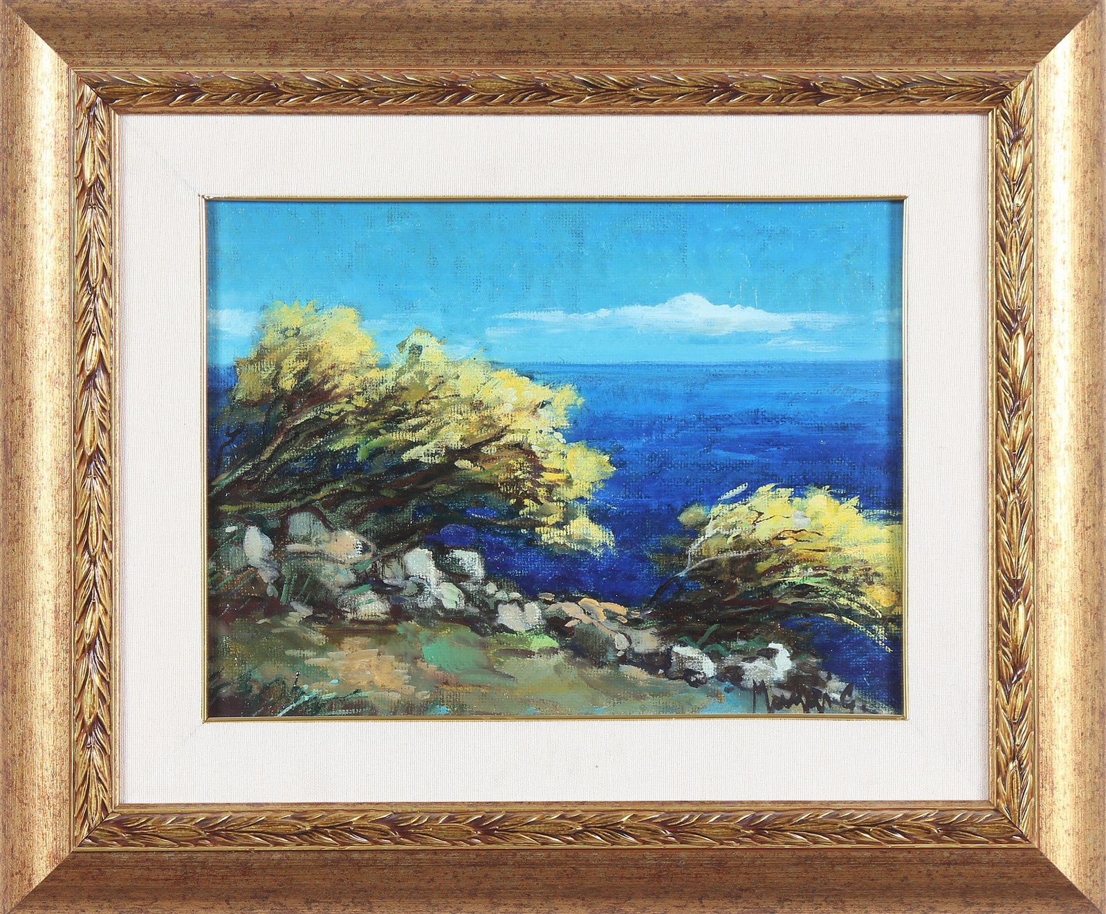 MAGGI GIAMPIETRO (n. 1934) Ginestre. 2003. Olio su tela . Cm 40,50 x 30,50. Firma in basso a destra. Al retro titolo, firma, dedica e anno. Cornice presente