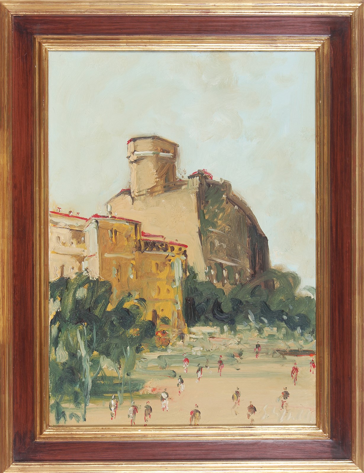CAPPELLO EMANUELE (n. 1936) Figure in città. Olio su tela . Cm 50,00 x 70,00. Firma in basso a destra. Cornice presente