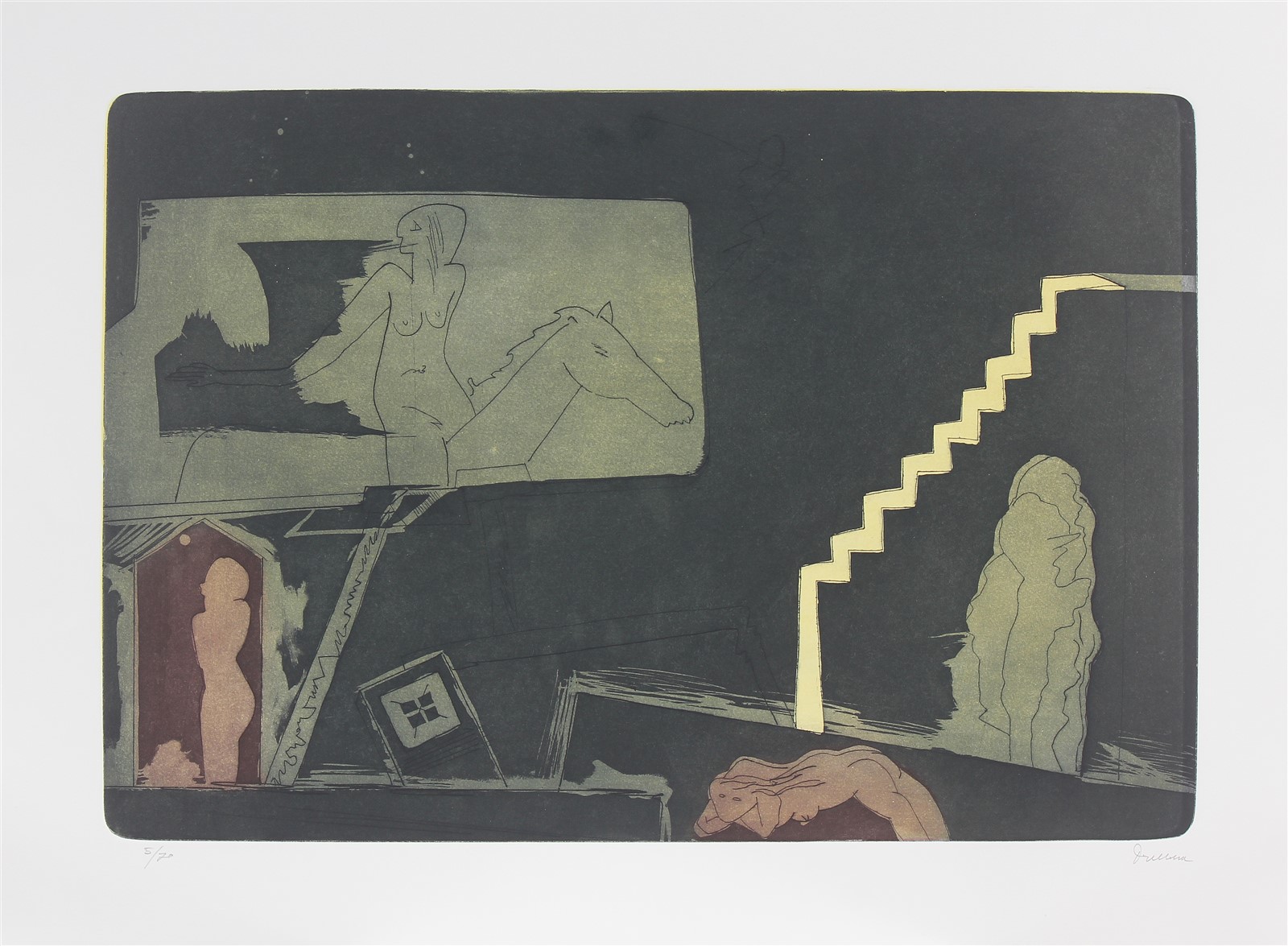 ORELLANA GASTON (n. 1933) Lotto composto da n. 9 grafiche. Bronx. Acquaforte. Cm 80,00 x 60,00. 5/70. Dimensioni lastre: 46.5x67 cm. Cartella composta da 9 di 10 acquaforti tirate in 70 esemplari a cura di Edizioni d'Arte Severgnini. Tutte le grafiche presentano tiratura e firma a matita in basso.