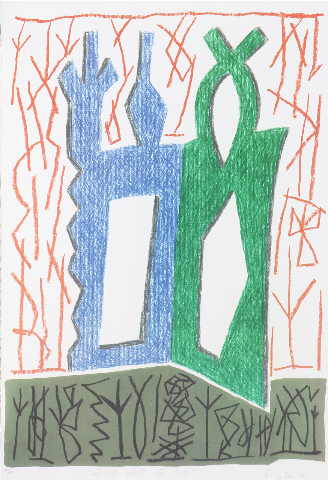 LICATA RICCARDO (n. 1929) Chi vi darà più luce. 2001. Serigrafia. Cm 34,00 x 49,00. 50/75. Tiratura, titolo, firma e anno in basso a matita. Timbro a secco Tintoretto, Venezia.