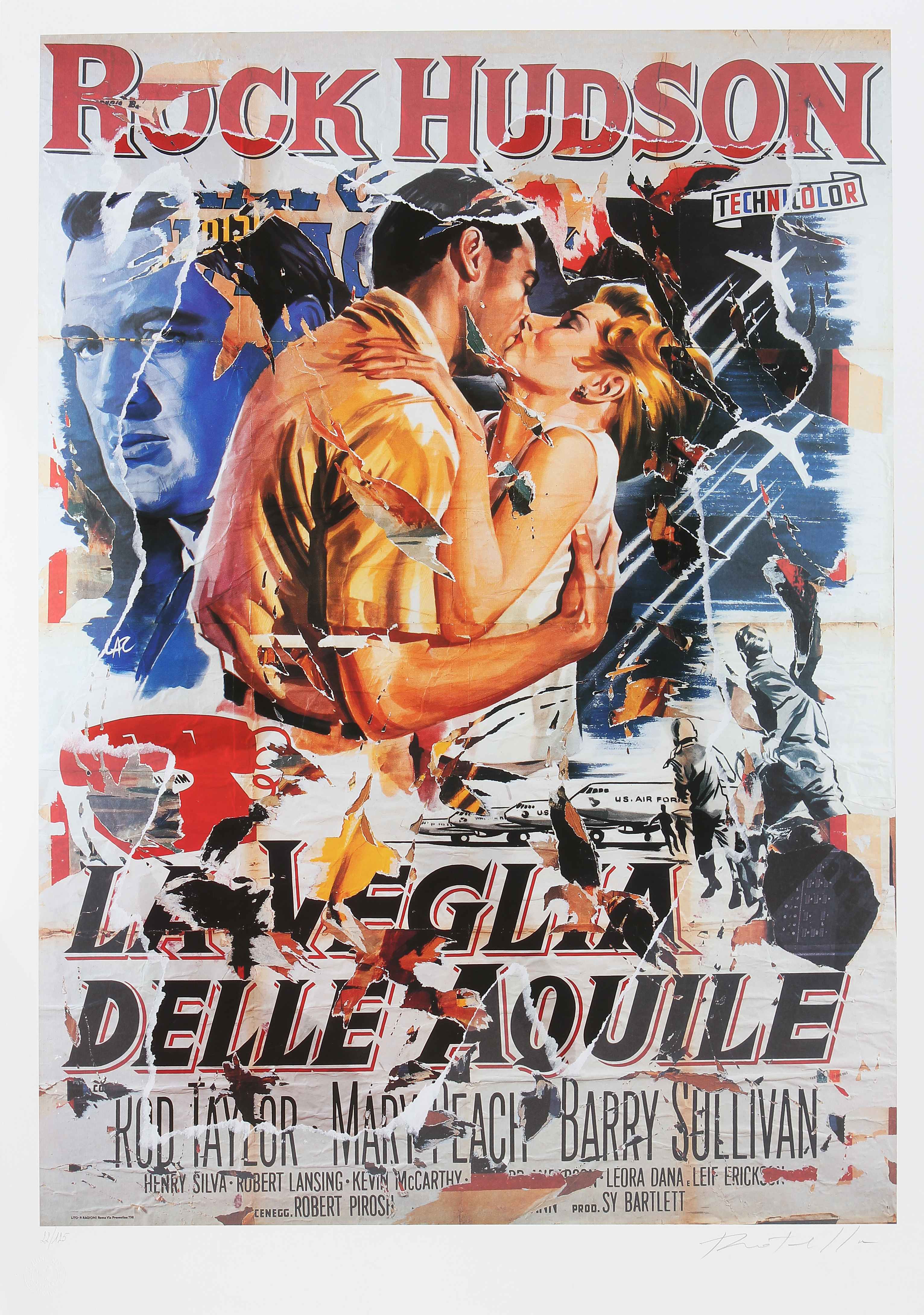 ROTELLA MIMMO (1918 - 2006) La veglia della aquile. Litodecollage. Cm 70,00 x 100,00. 22/125. Tiratura e firma a matita in basso. Timbro a secco a cura della Fondazione Mimmo Rotella, Milano. Opera pubblicata sul catalogo Mimmo Rotella - Multiples Décollages SilvanaEditoriale, Milano a pag. 46.