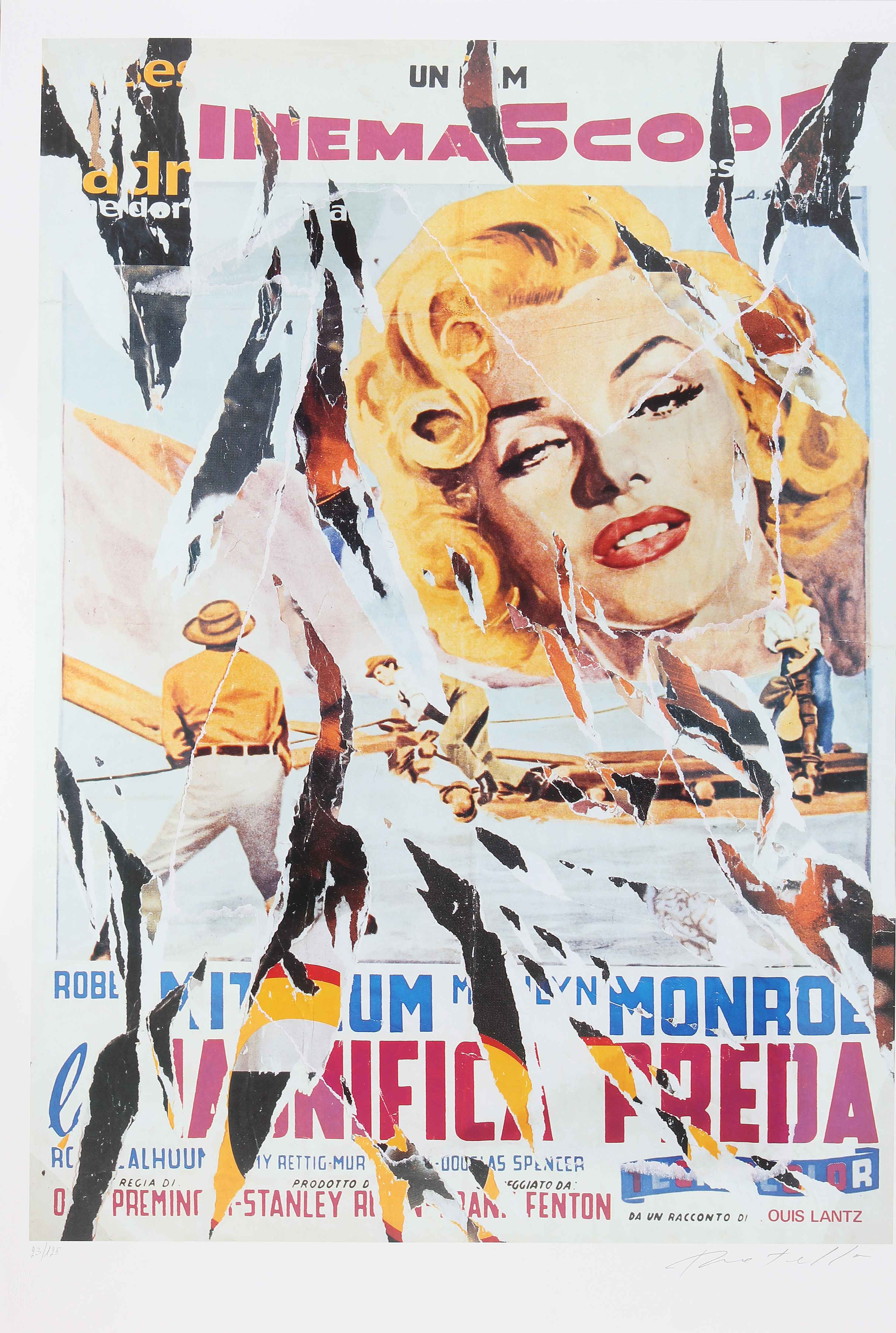 ROTELLA MIMMO (1918 - 2006) Marilyn. Litodecollage. Cm 70,00 x 100,00. 23/125. Tiratura e firma a matita in basso. Timbro a secco a cura della Fondazione Mimmo Rotella, Milano. Opera pubblicata sul catalogo Mimmo Rotella - Multiples Décollages SilvanaEditore, Milano a pag 35.