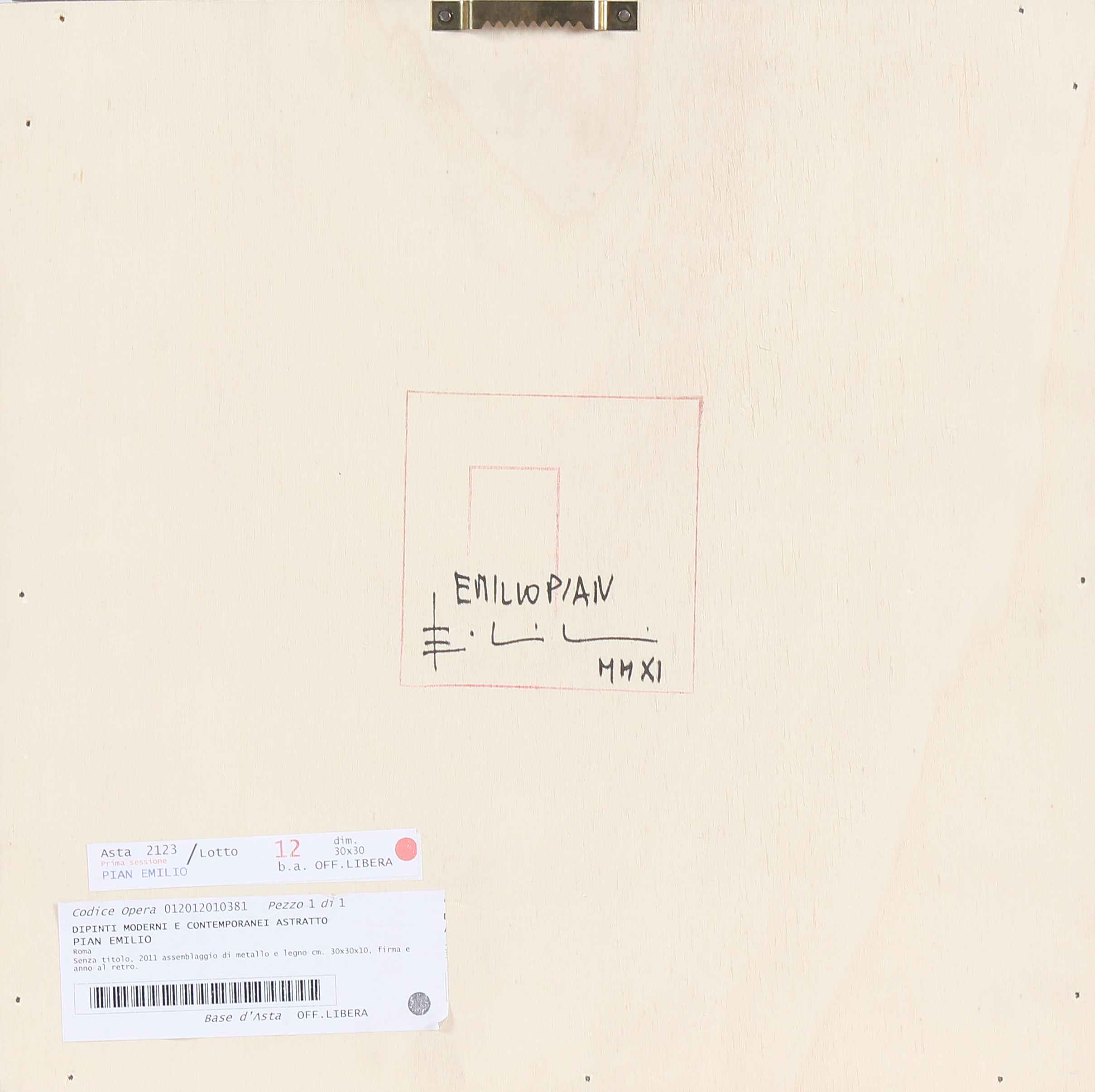 PIAN EMILIO (n. 1956) Senza titolo. 2011. Legno e metallo. Cm 31,00 x 31,00 x...