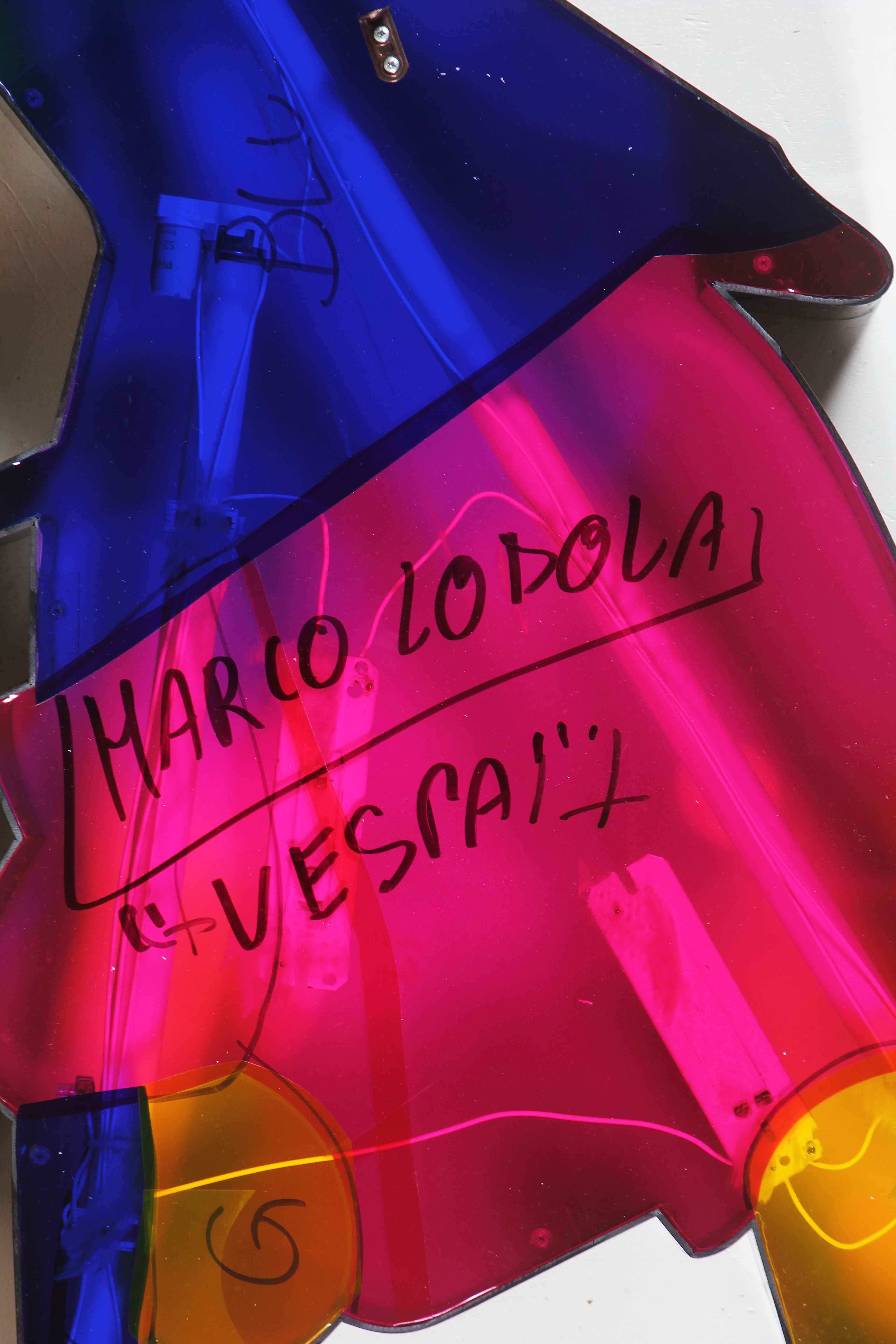 LODOLA MARCO (n. 1955) Vespa luminosa. installazione luminosa. Cm 54,00 x 104,00 x 13,00. Al retro firma. Autentica dell'artista su fotografia.