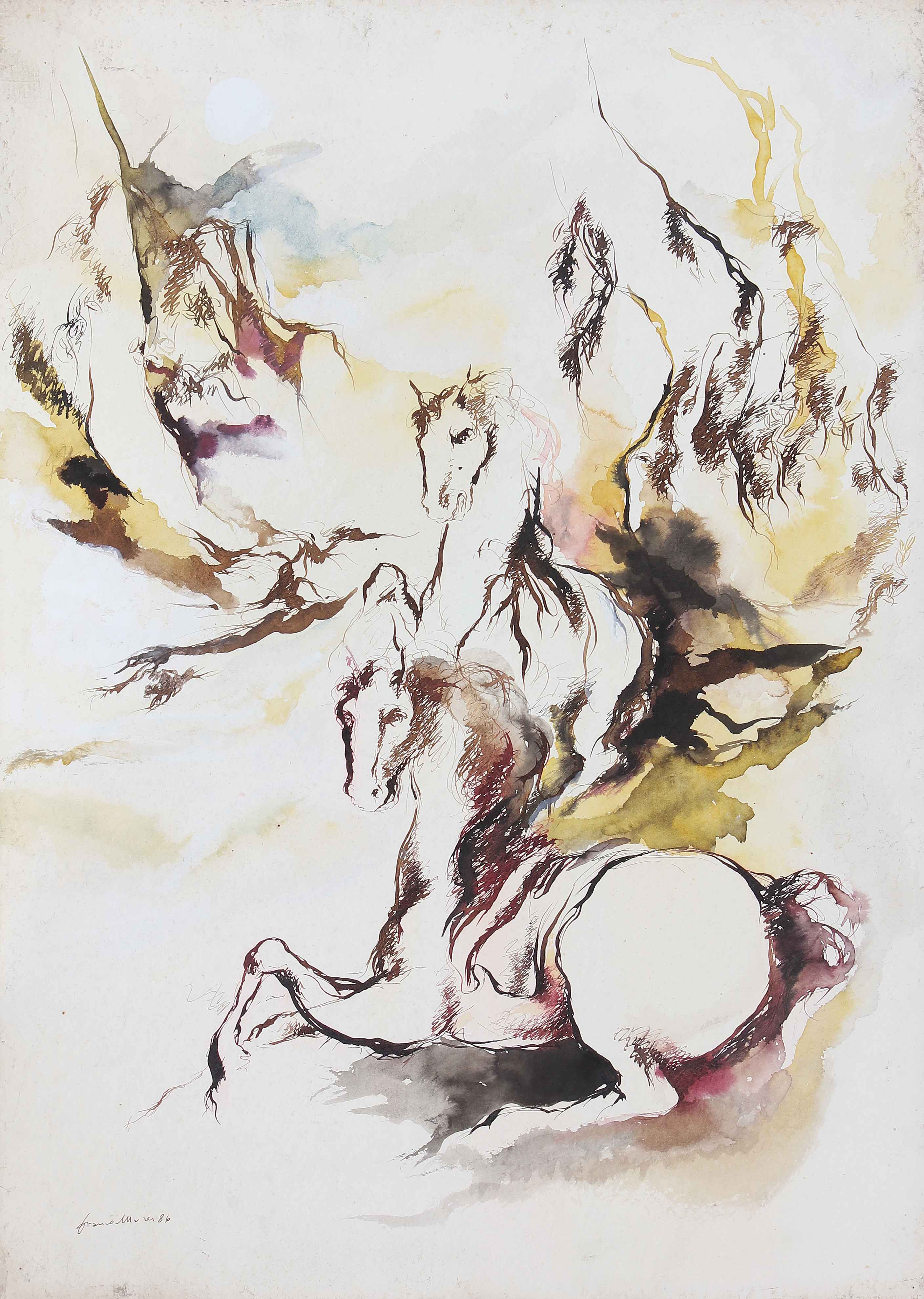 MURER FRANCO (n. 1952) Cavalli. 1986. Tecnica mista su carta intelata. Cm...