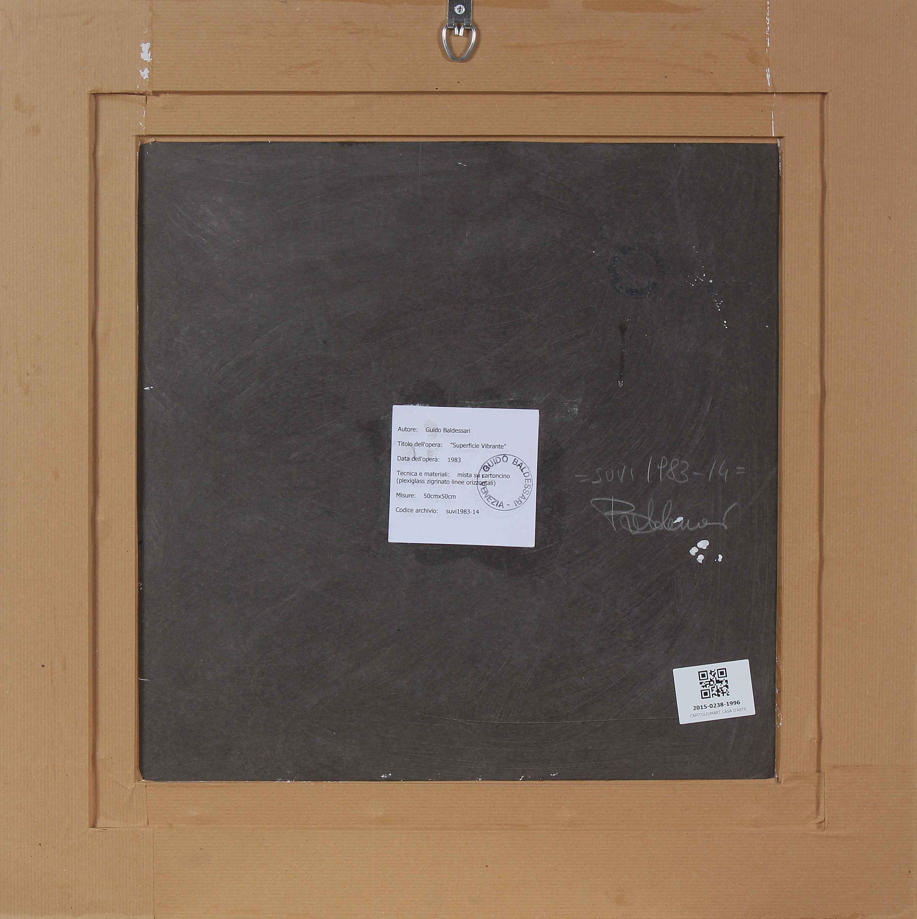 BALDESSARI GUIDO (n. 1938) Superficie vibrante. 1983. Tecnica mista su cartoncino. Cm 50,00 x 50,00. Al retro firma e cartiglio descrittivo con timbro Guido Baldessari, Venezia. Certificato di autenticità dell'opera con firma e timbro dell'artista a cura della Galleria d'Arte Contemporanea, Mestre - Venezia con relativo numero d'inventario. Cornice presente