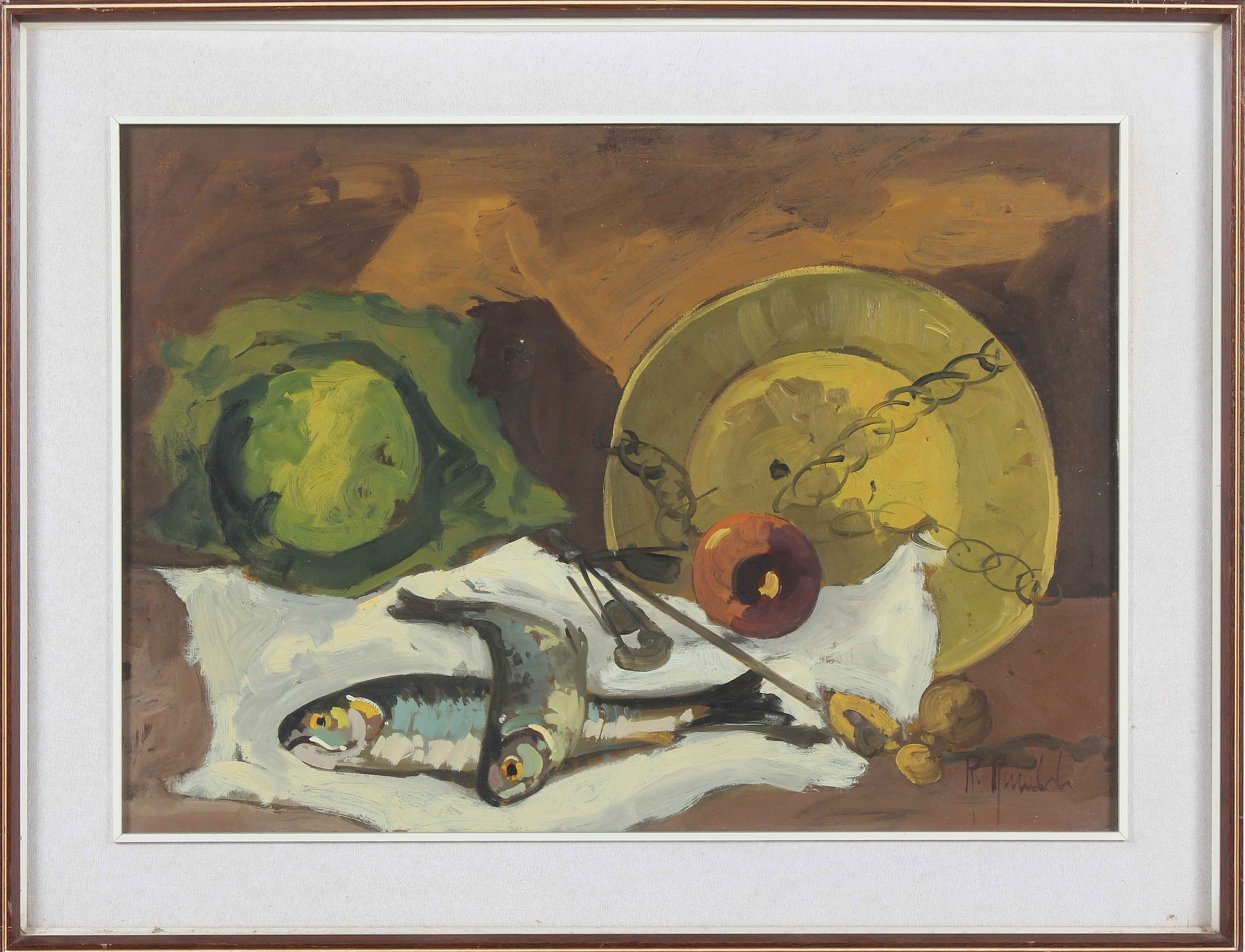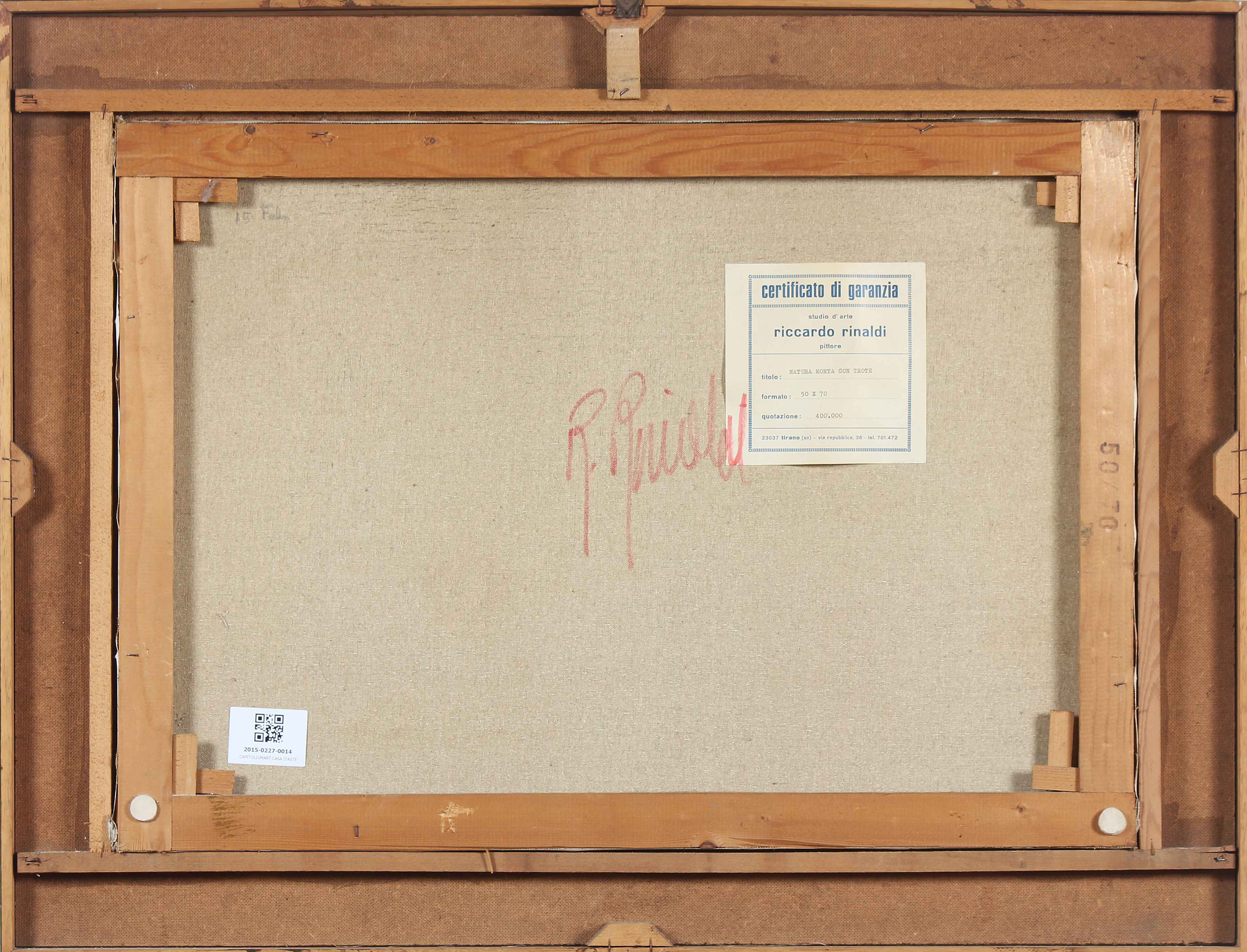 RINALDI RICCARDO (n. 1947) Natura morta con pesci. Olio su tela . Cm 70,00 x 50,00. Firma in basso a destra. Al retro firma e certificato di garanzia a cura dello Studio d'Arte Riccardo Rinaldi, Tirano. Cornice presente