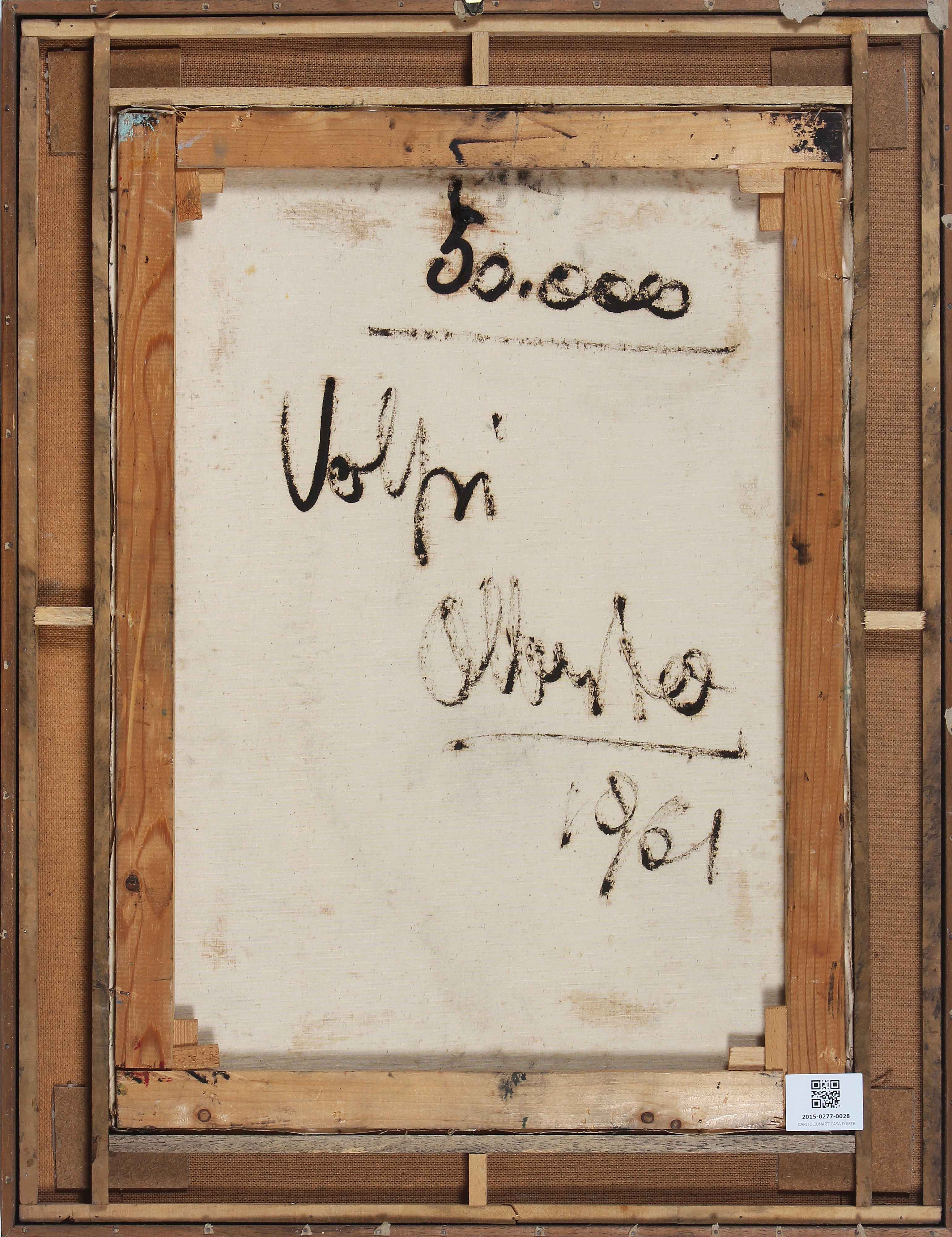 VOLPI ALBERTO (XX SEC.) Natura morta. 1961. Olio su tela . Cm 50,00 x 70,00. Firma in basso a sinistra. Al retro firma e anno. Cornice presente
