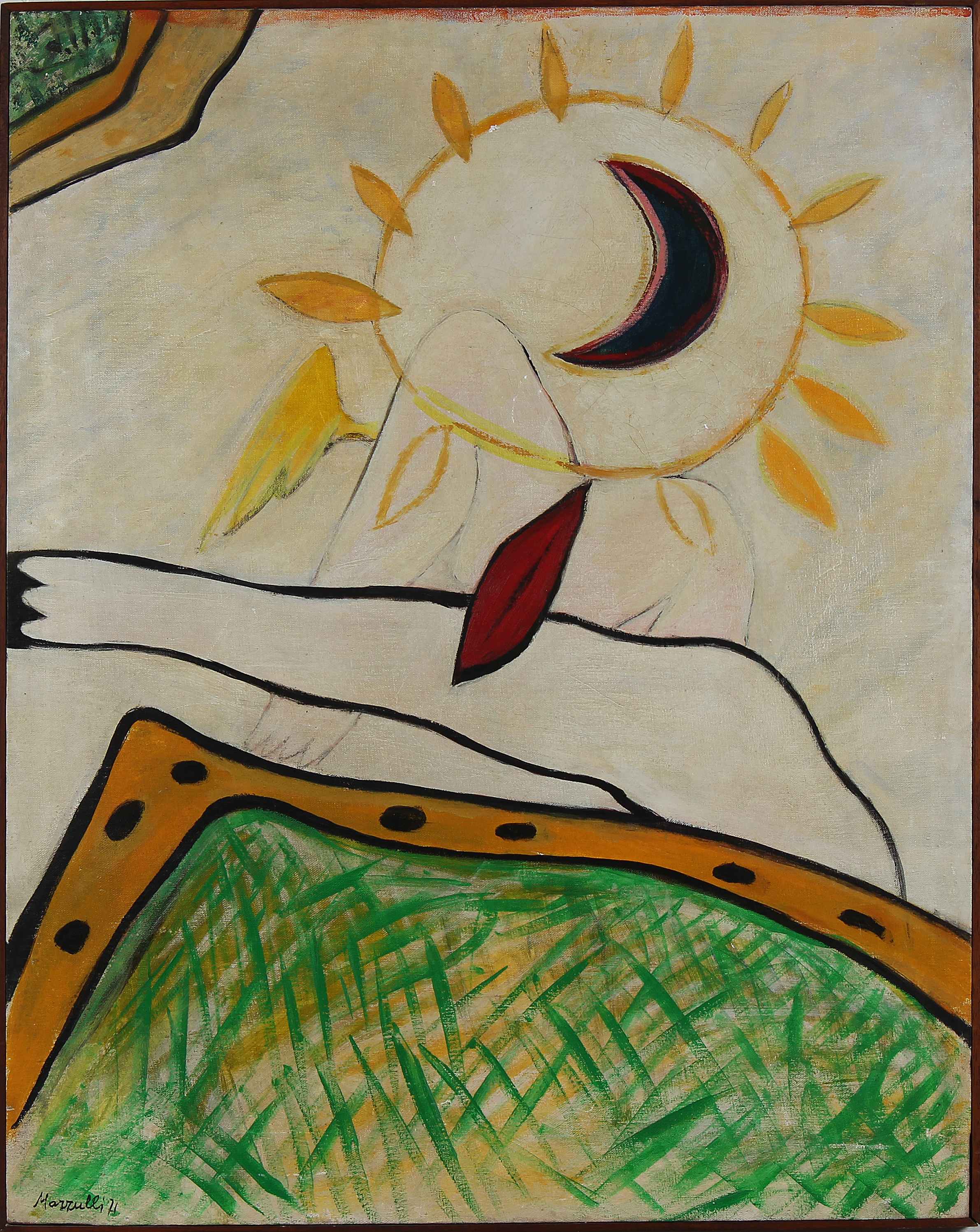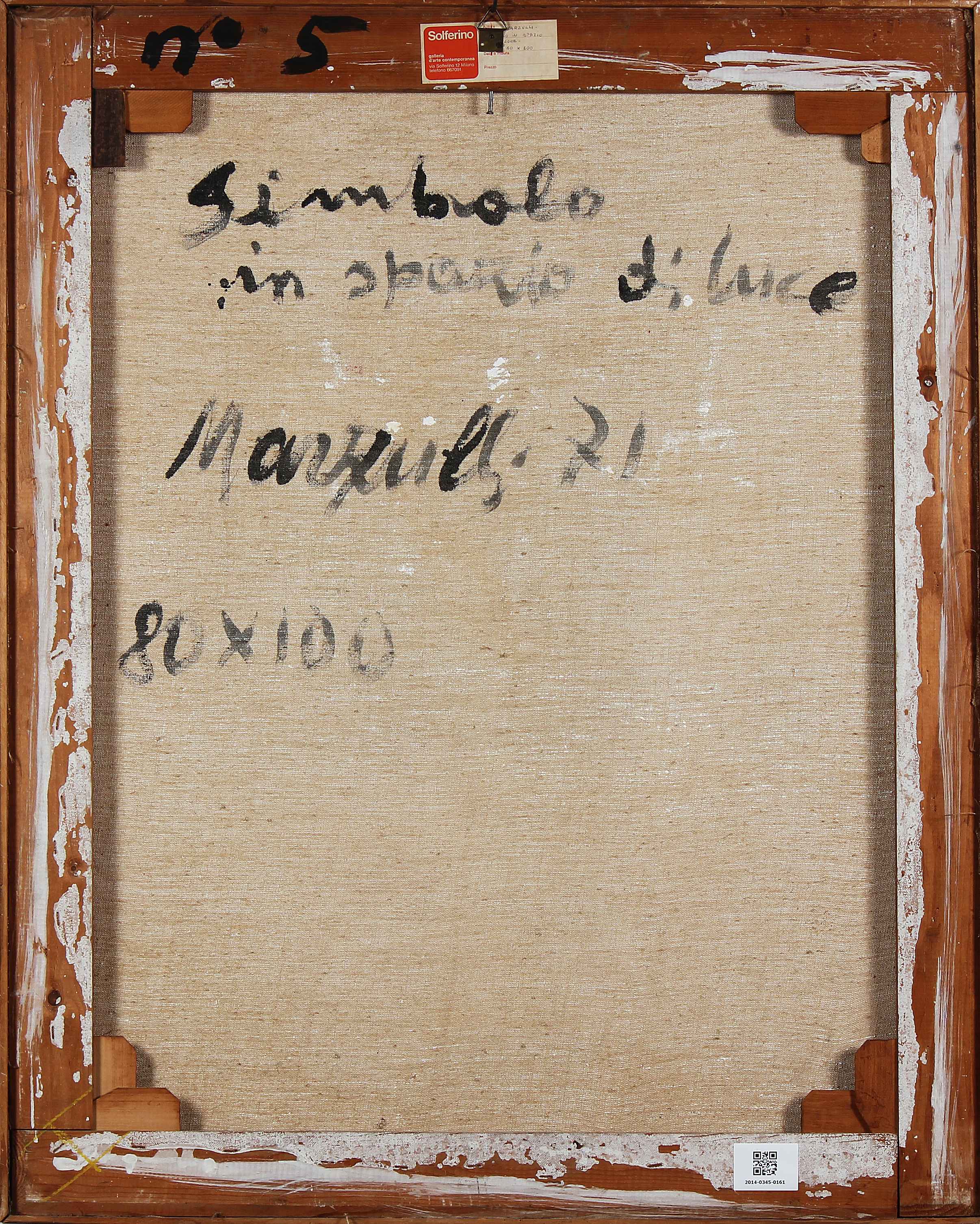 MARZULLI LINO (n. 1929) Simbolo in spazio di luce. Olio su tela . Cm 80,00 x 100,00. Al retro firma e titolo. Cornice presente
