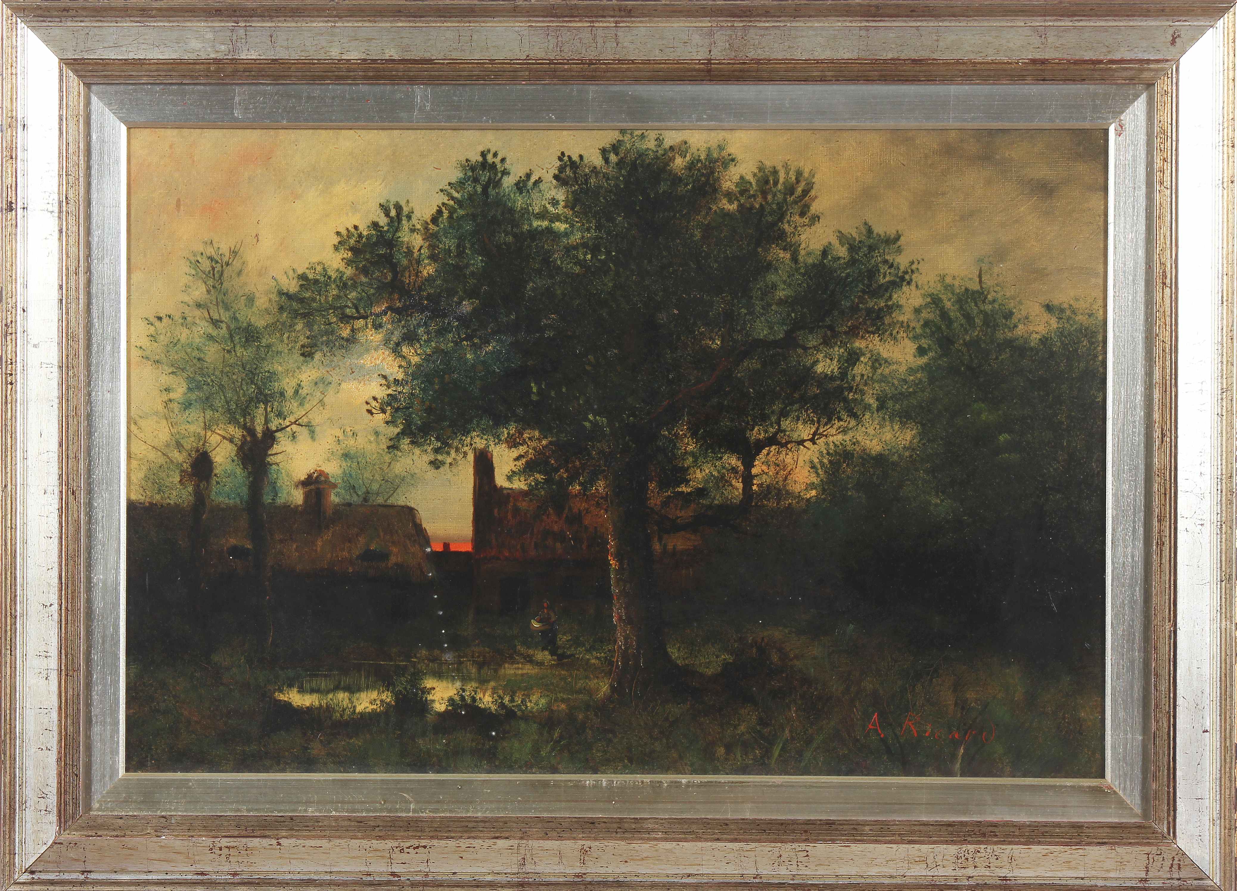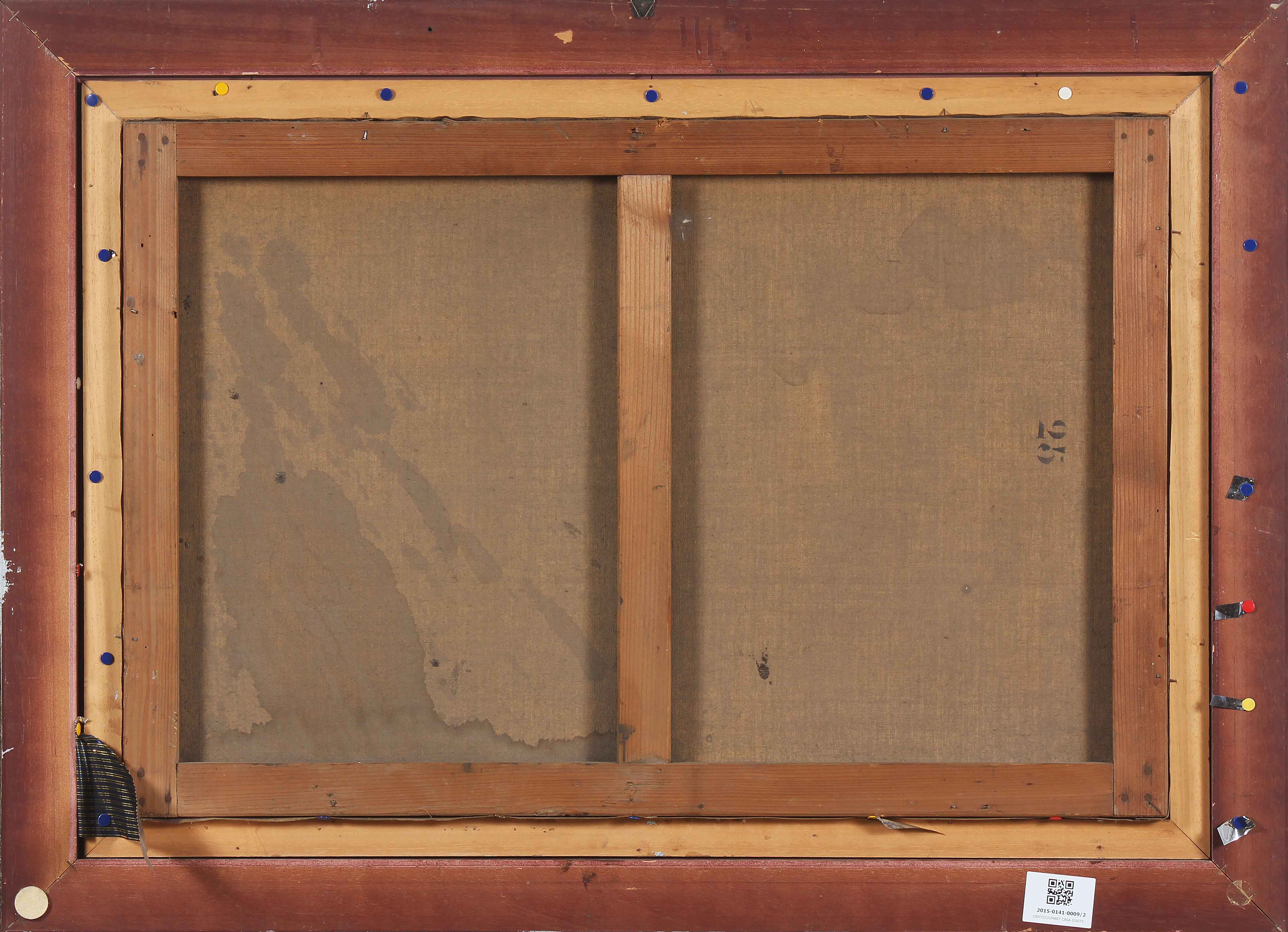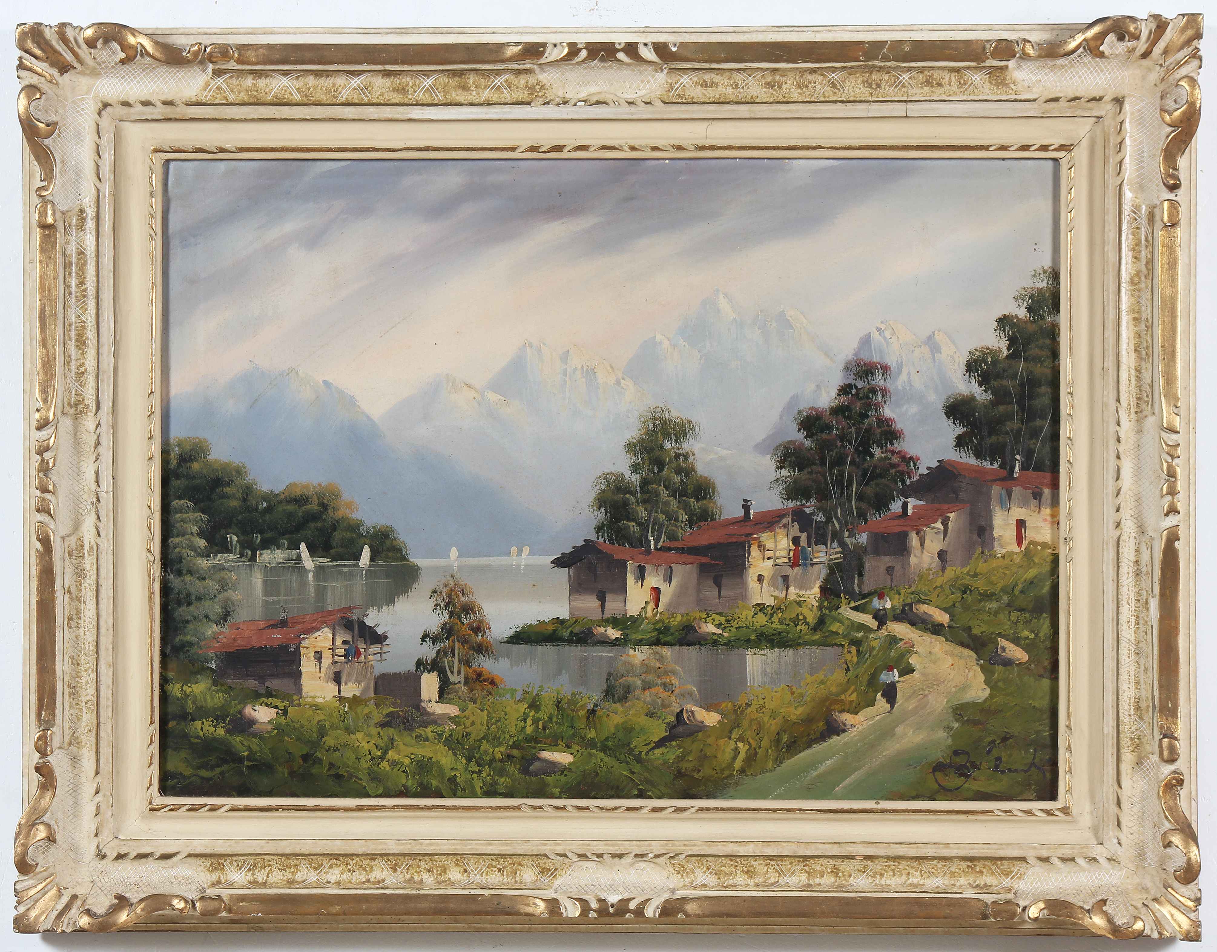 ANONIMO Lotto composto da n. 2 opere. Paesaggio lacustre. Paesaggio con figura. Olio su tela . Cm 80,00 x 55,00. Dimensioni opera n. 2: 50x70 cm. Entrambe le opere presentano una firma in basso a destra. Cornice presente