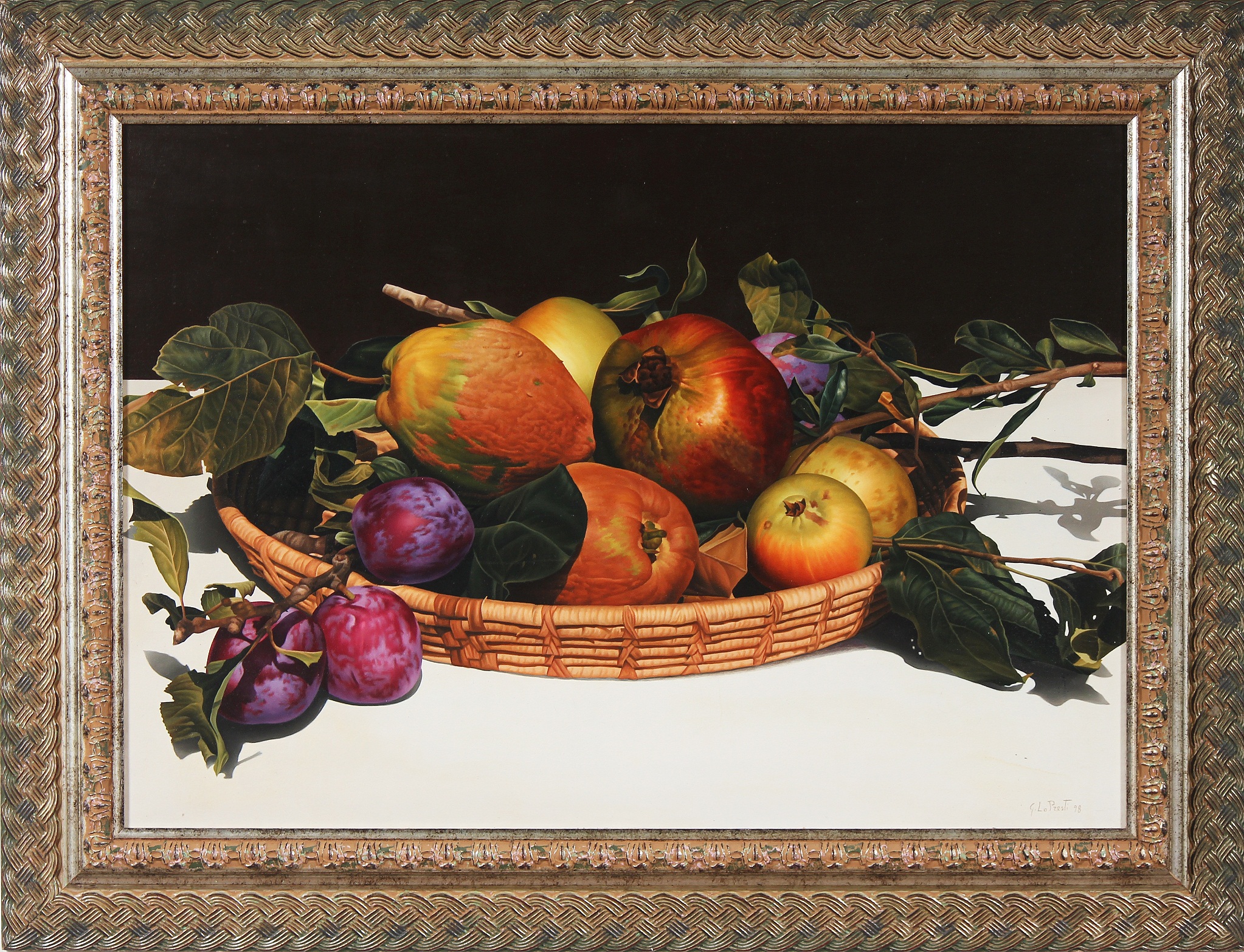 LO PRESTI GIOVANNI (n. 1952) Natura morta con melograno. 1998. Olio su tela . Cm 81,00 x 86,50. Firma in basso a destra e anno. Cornice presente