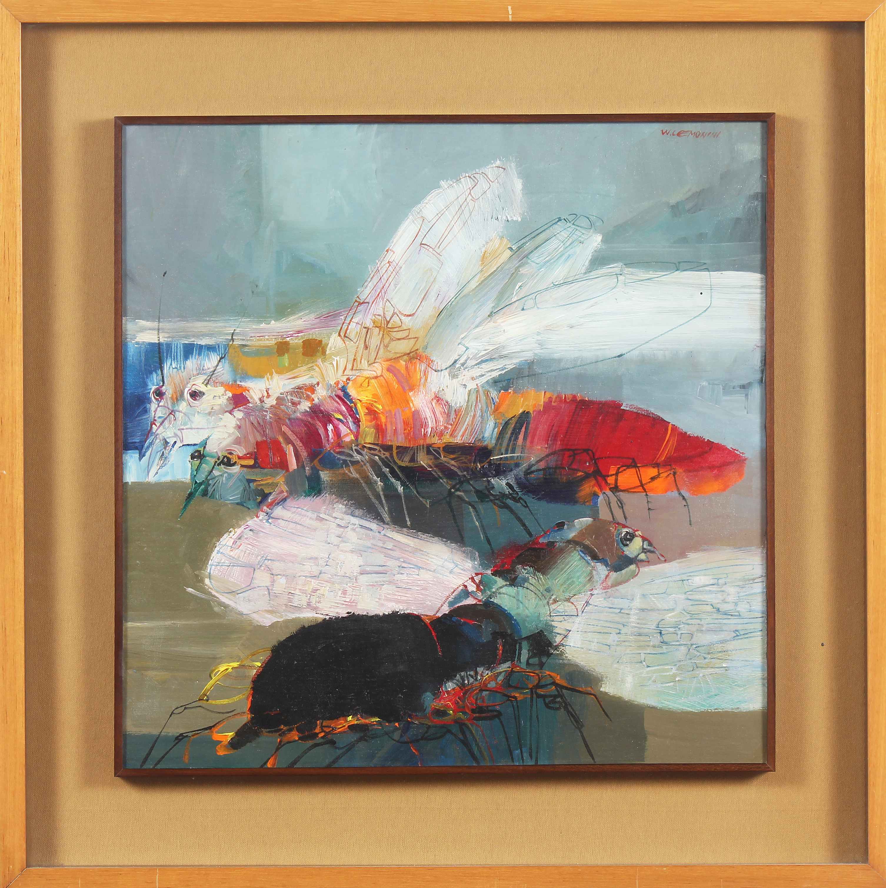CREMONINI WALTER (n. 1924) Api. Olio su tela . Cm 50,00 x 50,00. Firma in alto a destra. Cornice presente