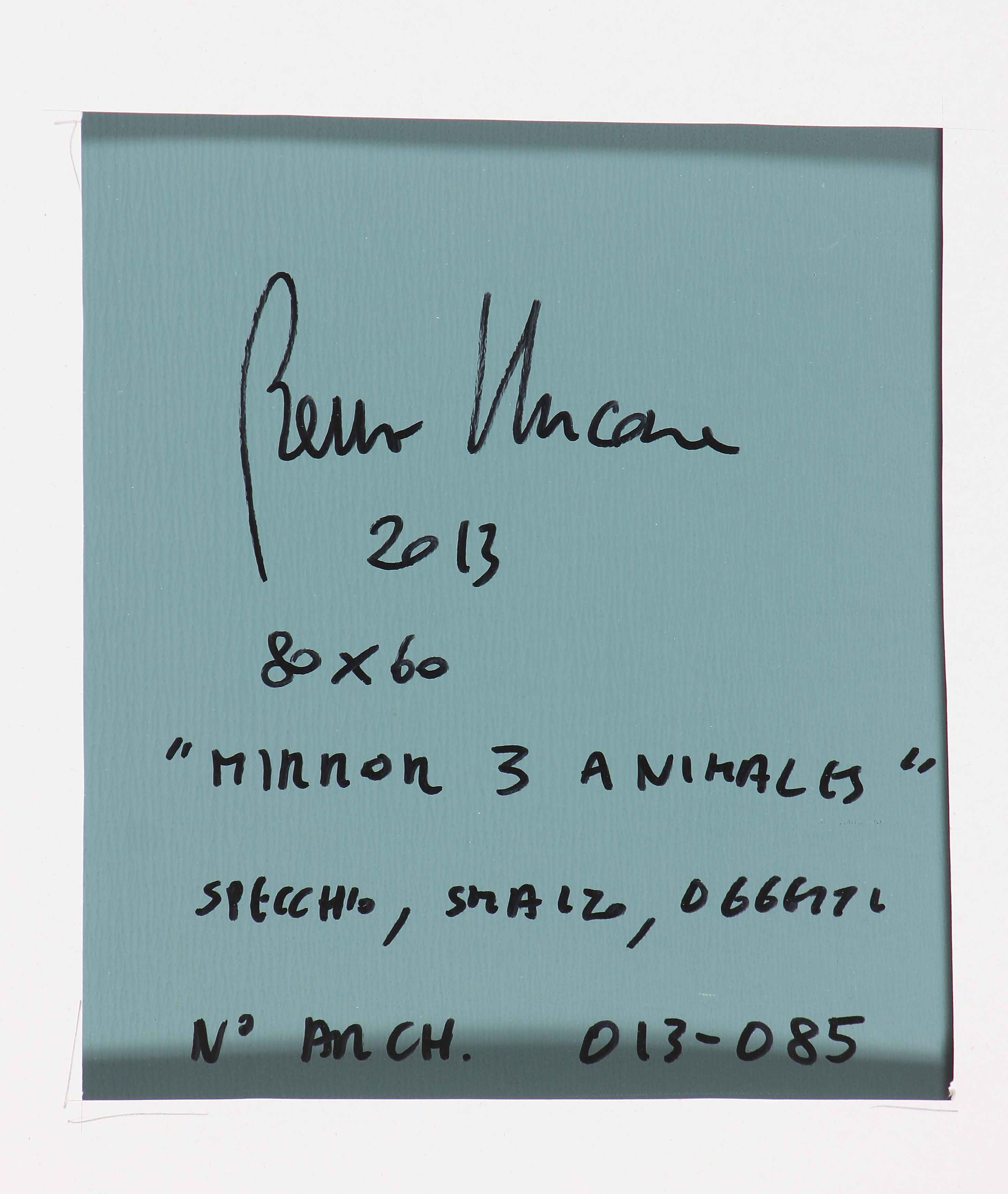 NUCARA RENZO (n. 1955) Mirror 3 Animales. 2013. Tecnica mista su specchio. Cm 60,00 x 80,00. Al retro titolo, firma, anno e numero d'archivio. Autentica dell'artista su fotografia con relativo numero d'inventario. Cornice presente