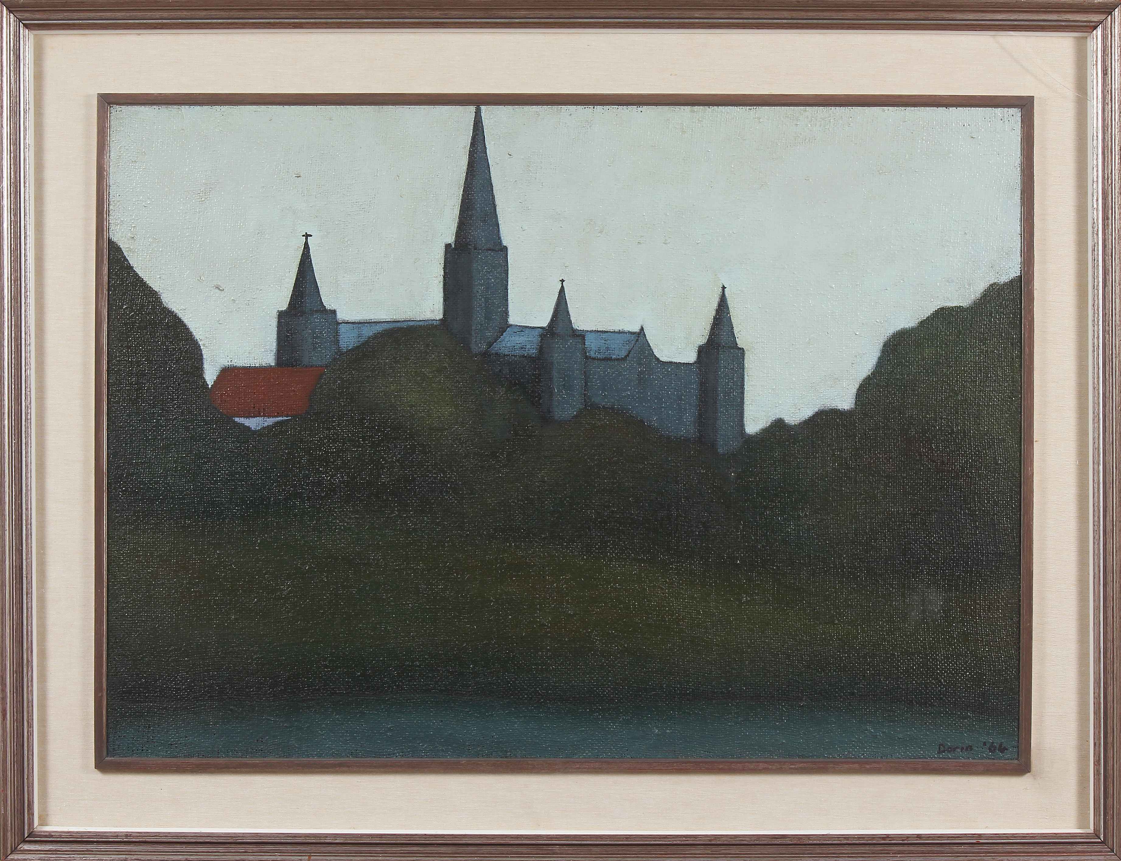 DORIN WALTER (n. 1929) Paesaggio con cattedrale. 1964. Olio su tela . Cm...