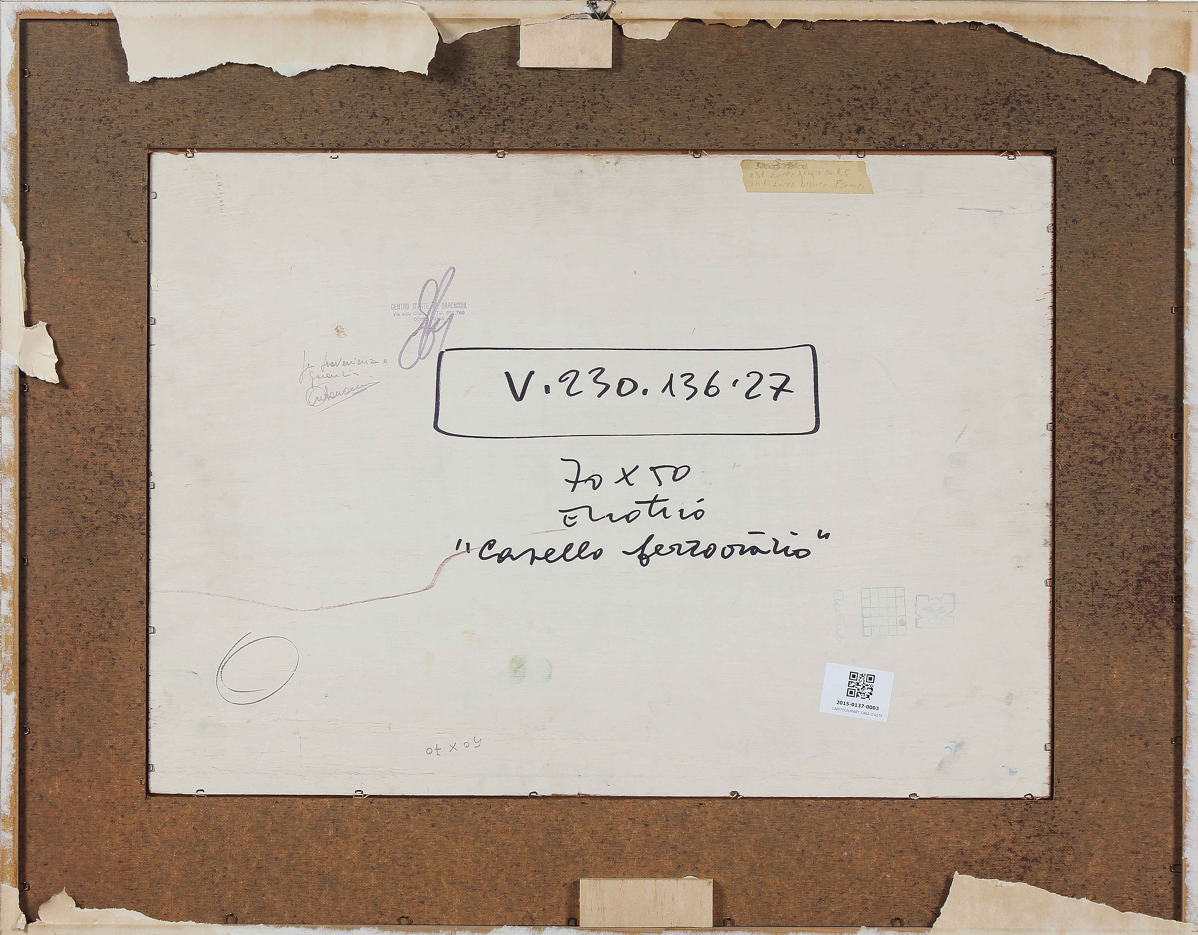 PUGLIESE ENOTRIO (1920 - 1988) Casello Ferroviario. Olio su tela . Cm 70,00 x 50,00. Firma in basso a destra. Al retro titolo e timbro a cura del Centro d'arte Barcaccia, Roma. Cornice presente