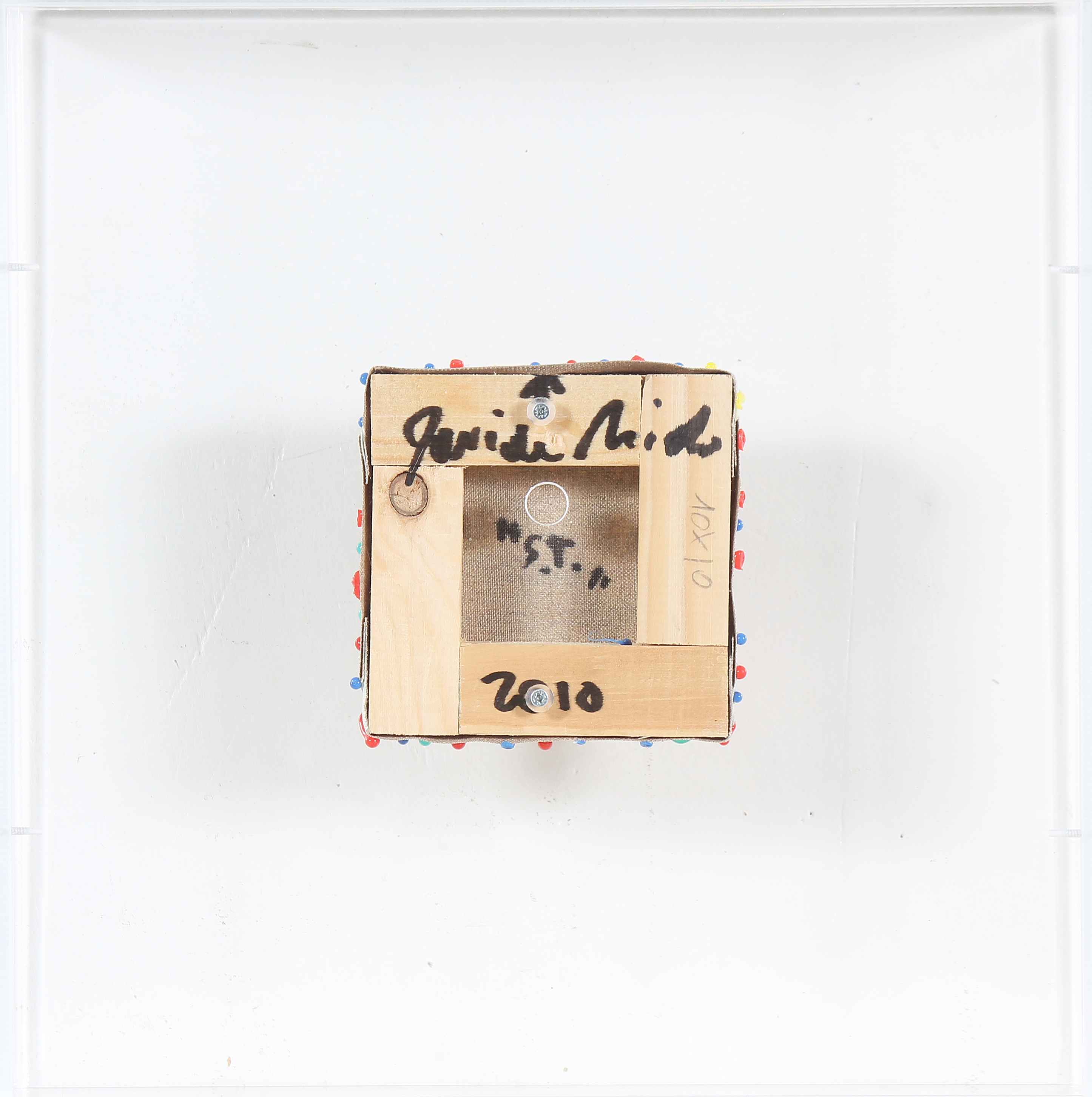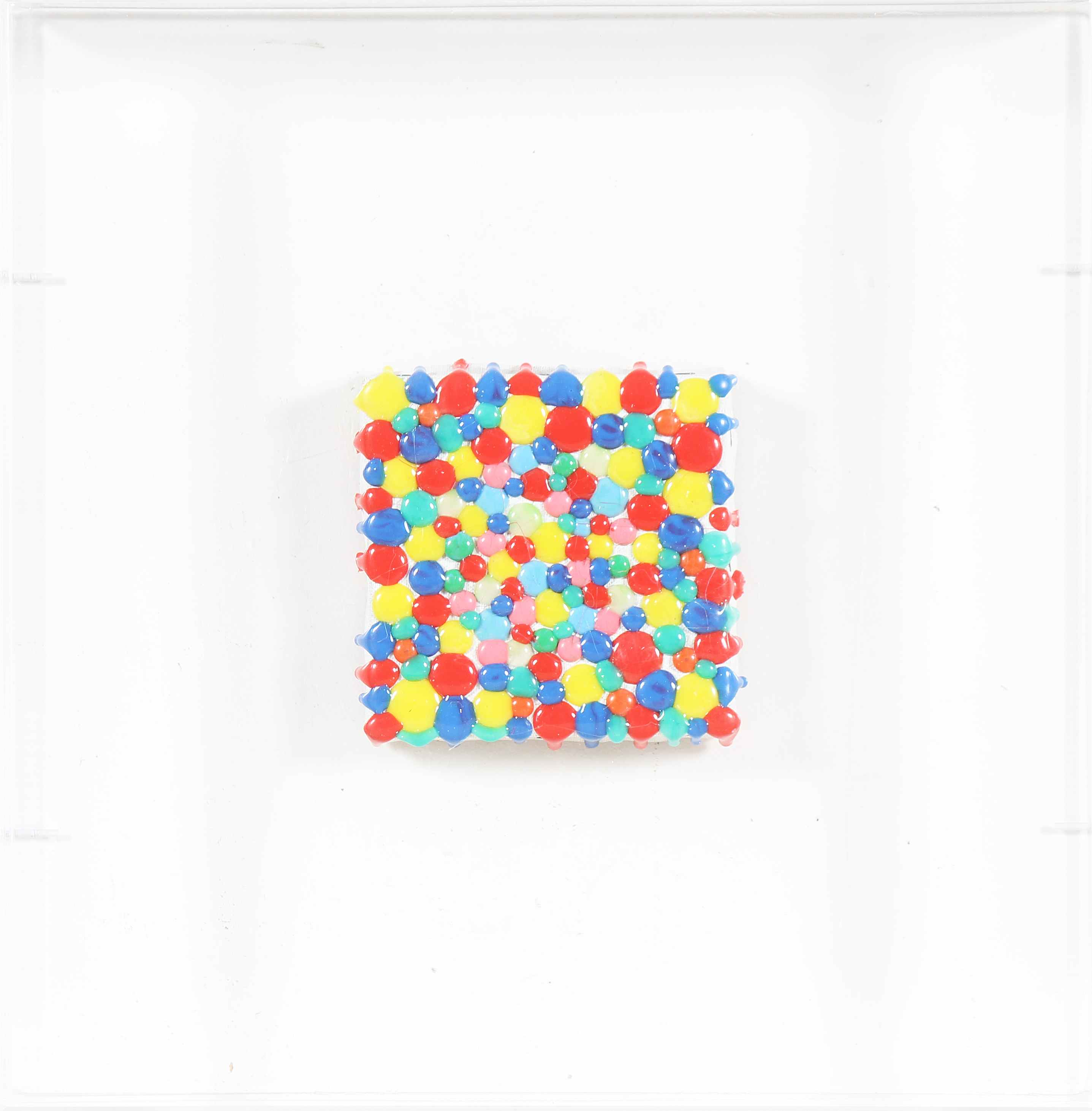 NIDO DAVIDE (1966 - 2014) Senza titolo. 2010. Colle termofusibili su tela. Cm 10,00 x 10,00. Al retro firma, titolo e anno. Autentica dell'artista su fotografia. Opera contenuta in una teca di plexiglass. Cornice presente