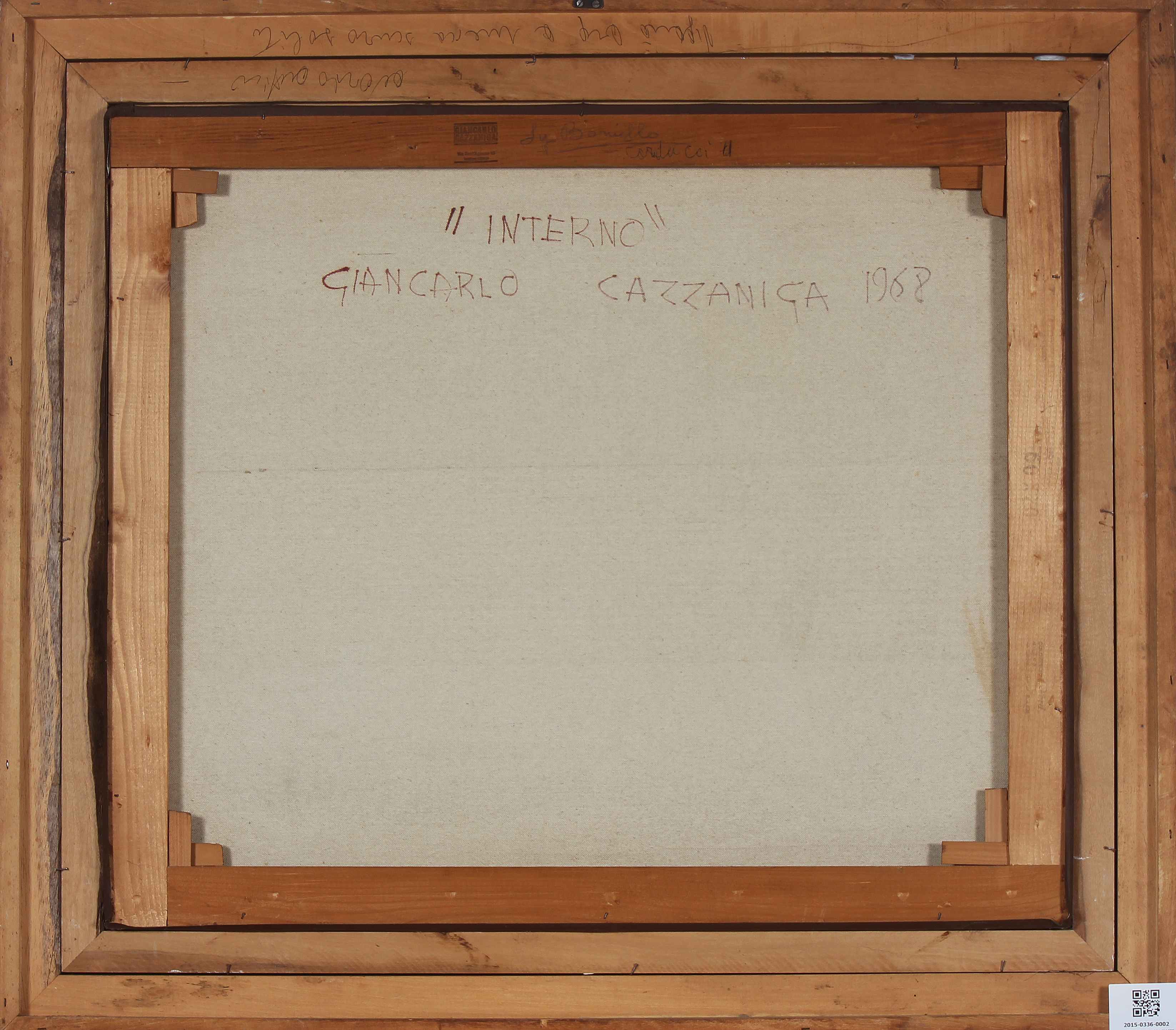 CAZZANIGA GIANCARLO (n. 1930) Interno. 1968. Olio su tela . Cm 70,00 x 60,00. Firma in basso a destra. Al retro titolo, firma e anno. Cornice presente