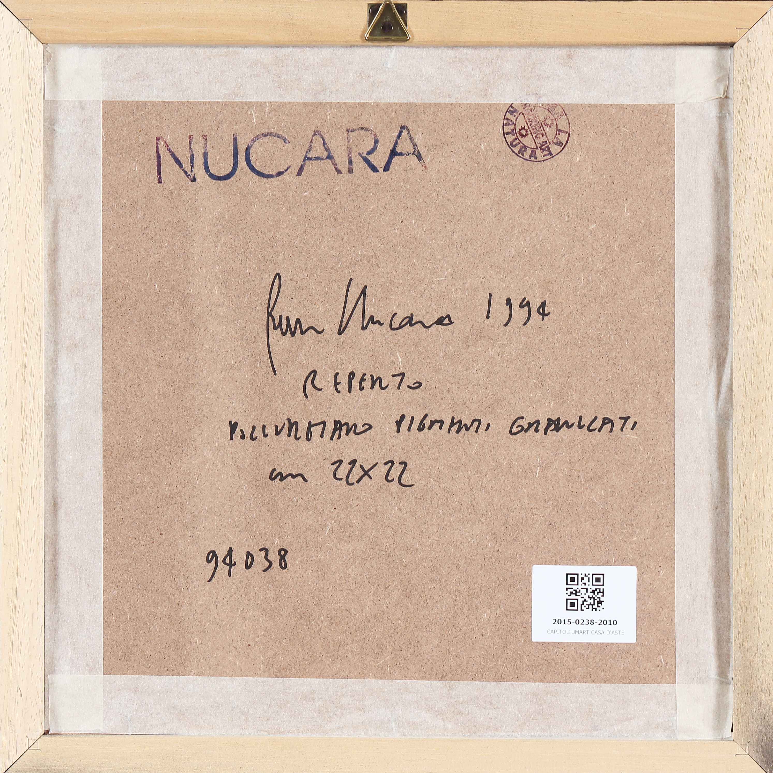 NUCARA RENZO (n. 1955) Reperto. 1994. Poliuretano e pigmenti.. Cm 22,00 x 22,00. Al retro titolo, firma, anno e timbro Cracking Art. Autentica dell'artista su fotografia con relativo numero d'inventario. Cornice presente
