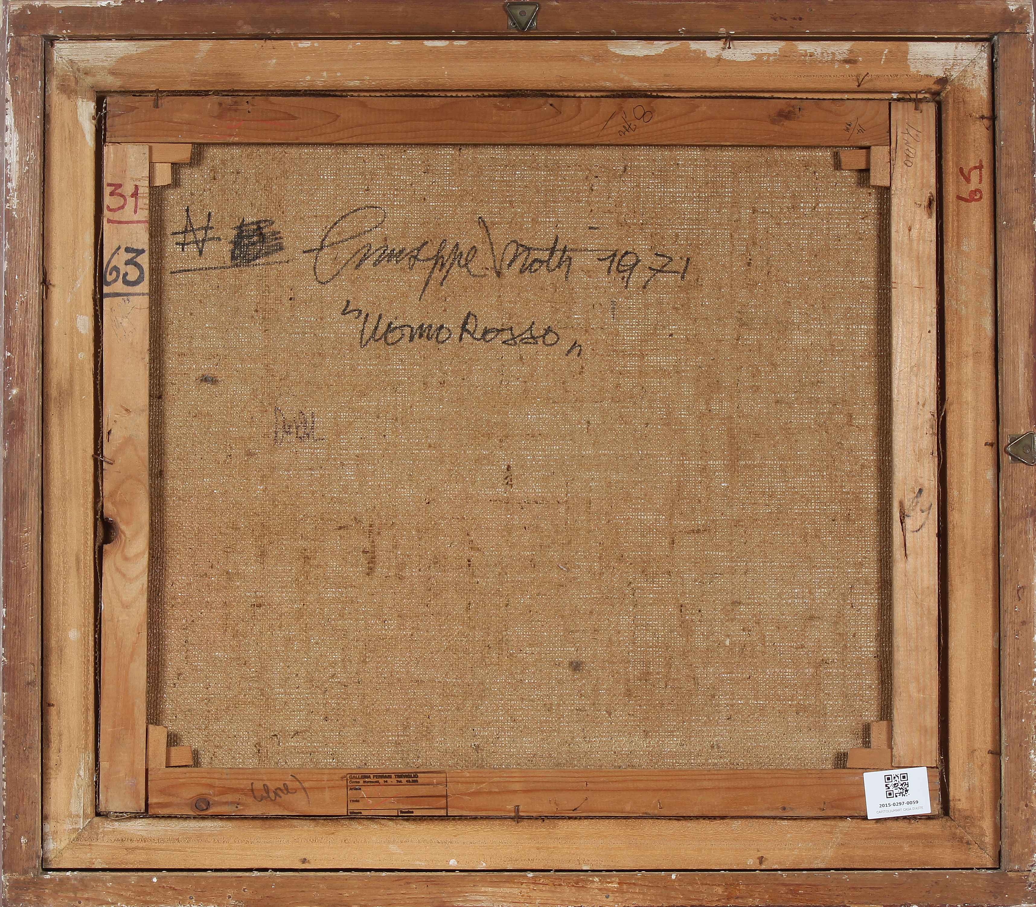 MOTTI GIUSEPPE (1908 - 1990) Uomo rosso. 1971. Olio su tela . Cm 70,00 x 60,00. Firma e anno in basso a sinistra. Al retro titolo, firma, anno e timbro a cura della Galleria Ferrari, Treviglio. PROVENIENZA: EREDITA' MARCELLO FERRARI, GALLERIA FERRARI, TREVIGLIO. . Cornice presente