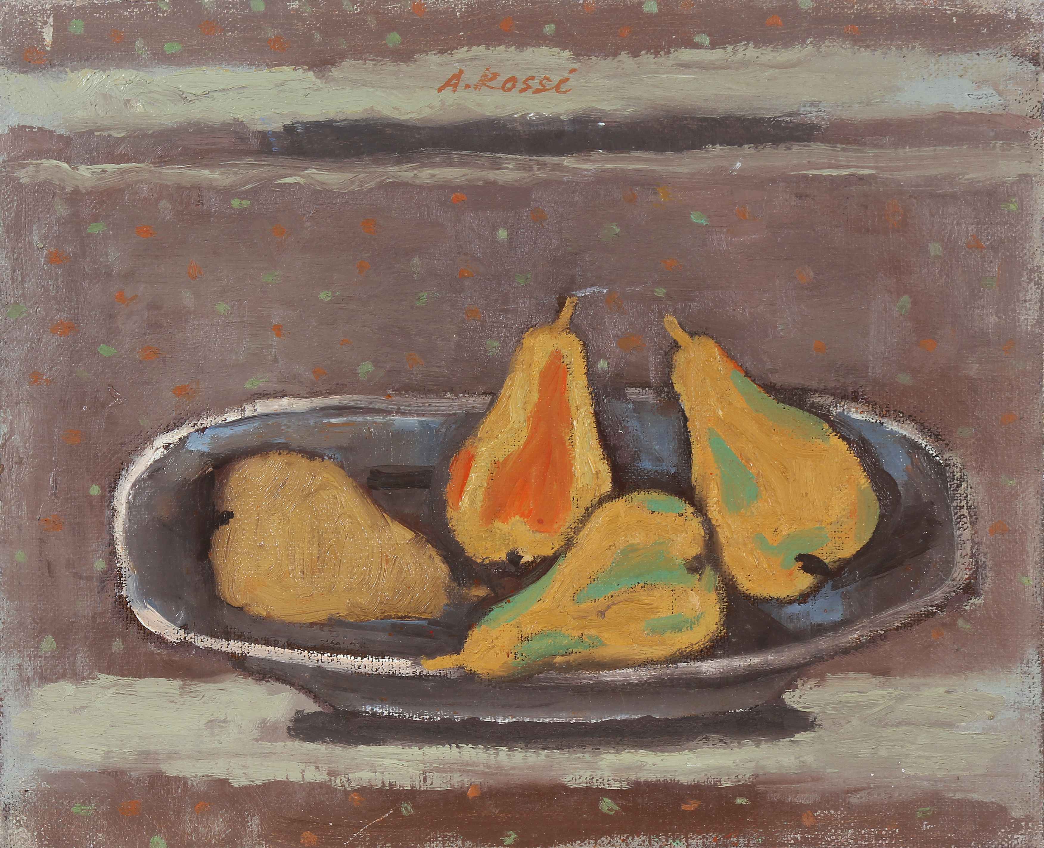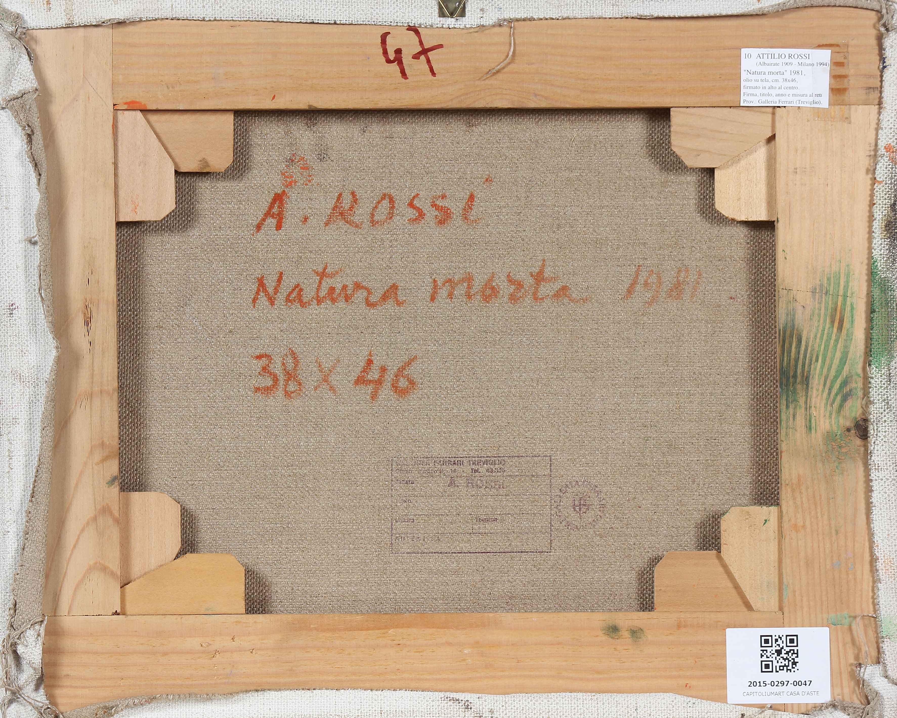ROSSI ATTILIO (1909 - 1994) Natura morta. 1981. Olio su tela . Cm 46,00 x 38,00. Al retro titolo, firma, anno e timbro a cura della Galleria Ferrari, Treviglio. PROVENIENZA: EREDITA' MARCELLO FERRARI, GALLERIA FERRARI, TREVIGLIO.