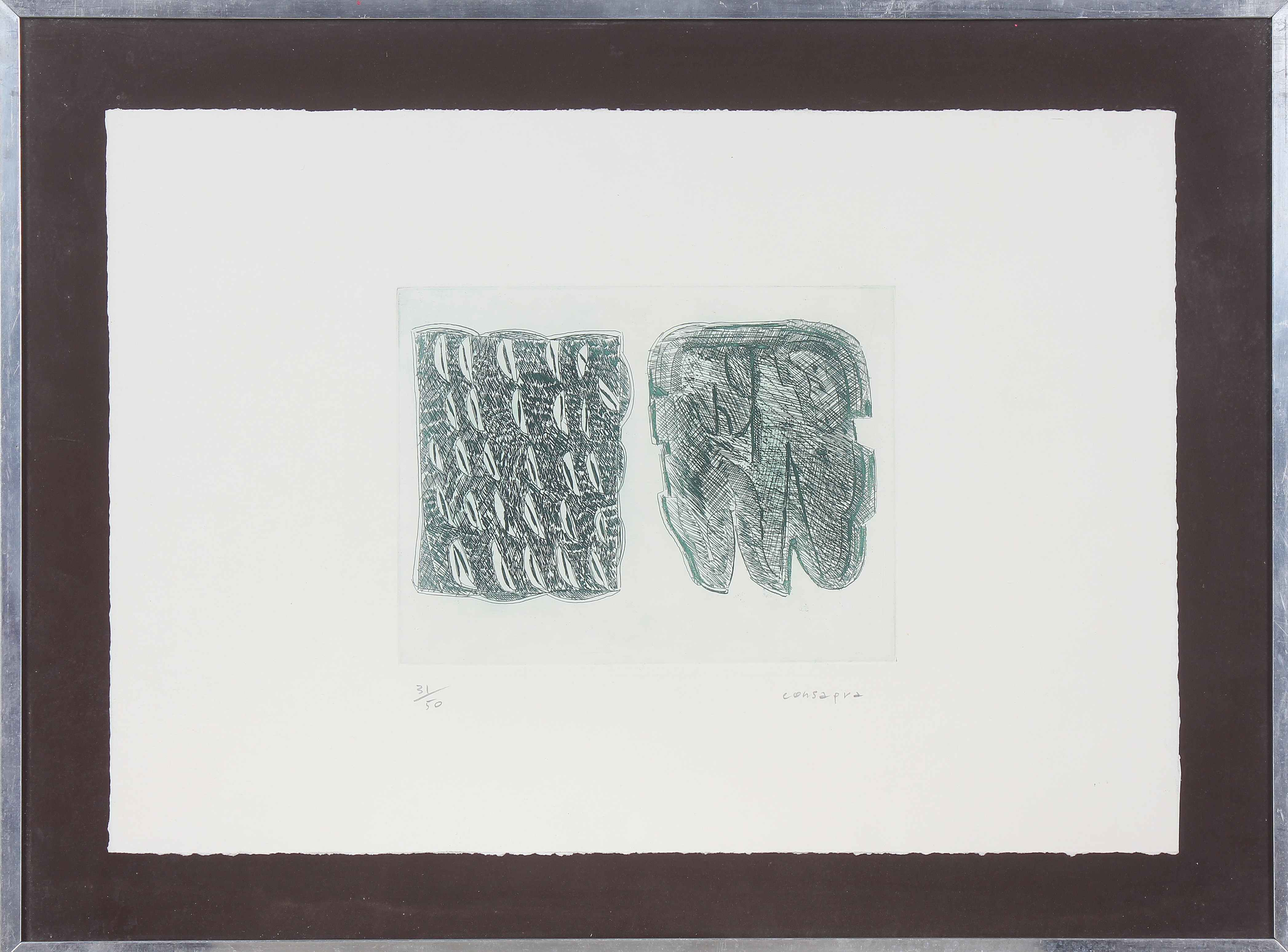 CONSAGRA PIETRO (1920 - 2005) Senza titolo. Acquaforte. Cm 50,00 x 35,00. 31/50. Tiratura e firma a matita in basso. Dimensione lastra: 18x23 cm. PROVENIENZA: EREDITA' MARCELLO FERRARI, GALLERIA FERRARI, TREVIGLIO. . Cornice presente
