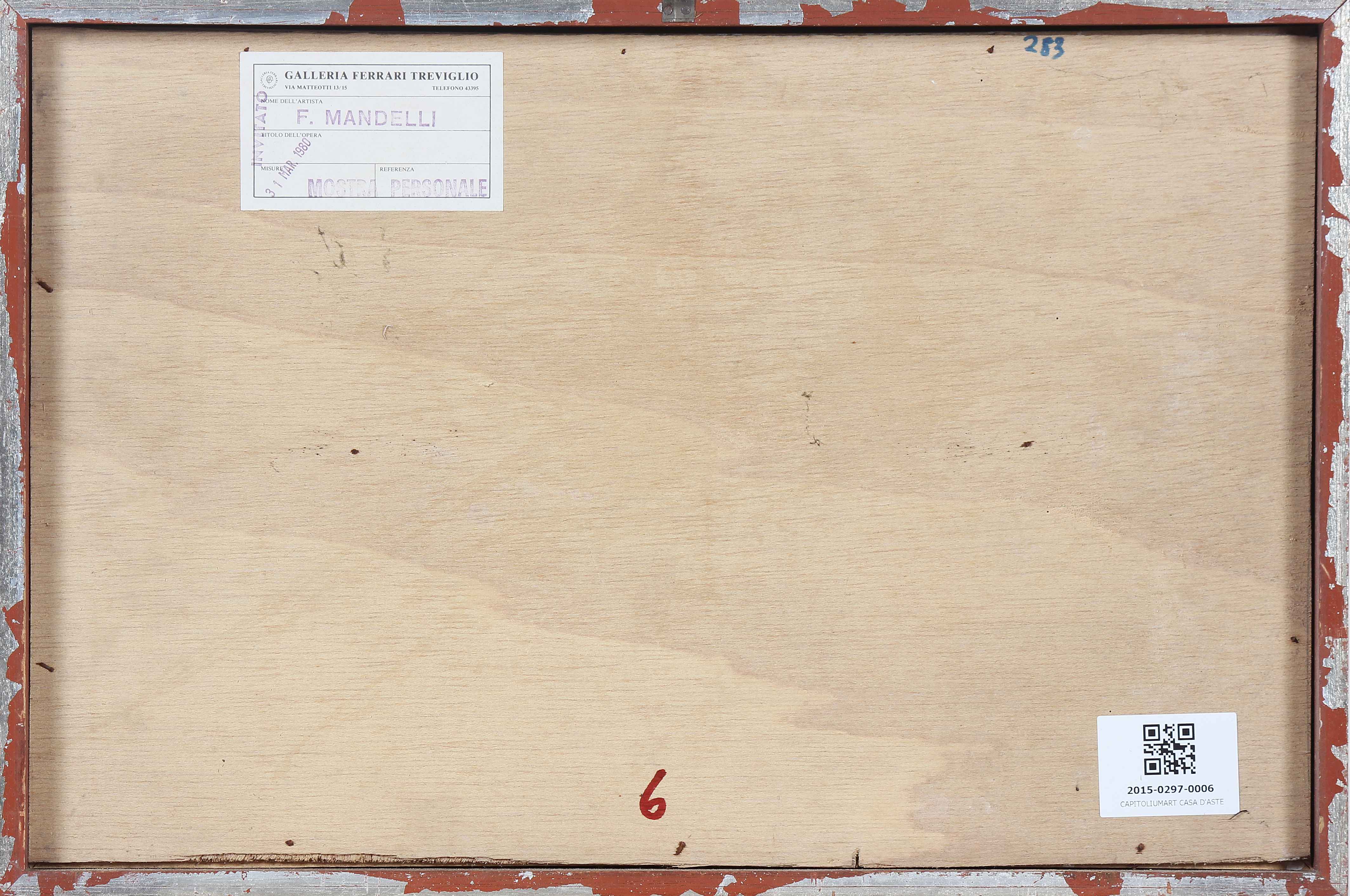 MANDELLI FERNANDO (n. 1943) Senza titolo. 1977. Tecnica mista su cartone. Cm 30,00 x 13,00. Firma e anno in basso a destra. Al retro Cartiglio descrittivo a cura della Galleria Ferrari, Treviglio. PROVENIENZA: EREDITA' MARCELLO FERRARI, GALLERIA FERRARI, TREVIGLIO. . Cornice presente