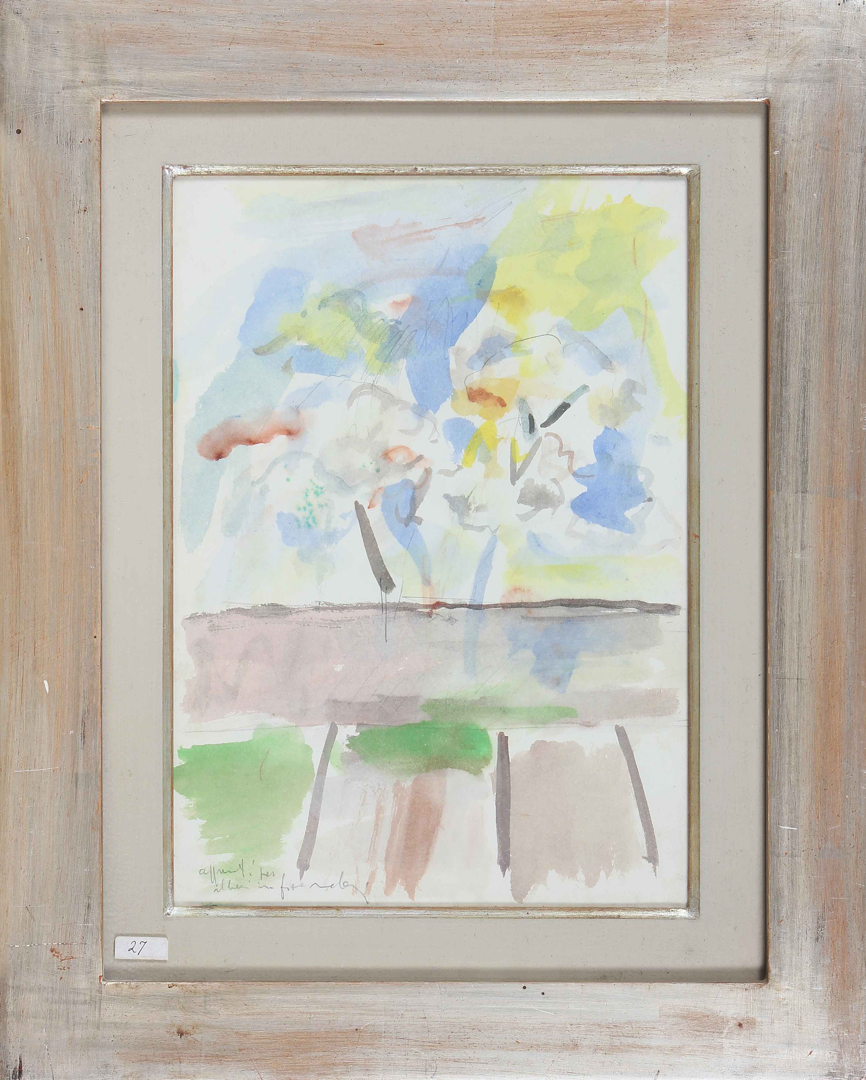 MELONI GINO (1905 - 1989) Appunti per alberi in fiore. Tecnica mista su carta. Cm 25,00 x 35,00. Firma e titolo in basso a sinistra. Al retro timbro per autentica a cura della Galleria Ferrari, Treviglio. PROVENIENZA: EREDITA' MARCELLO FERRARI, GALLERIA FERRARI, TREVIGLIO. Cornice presente