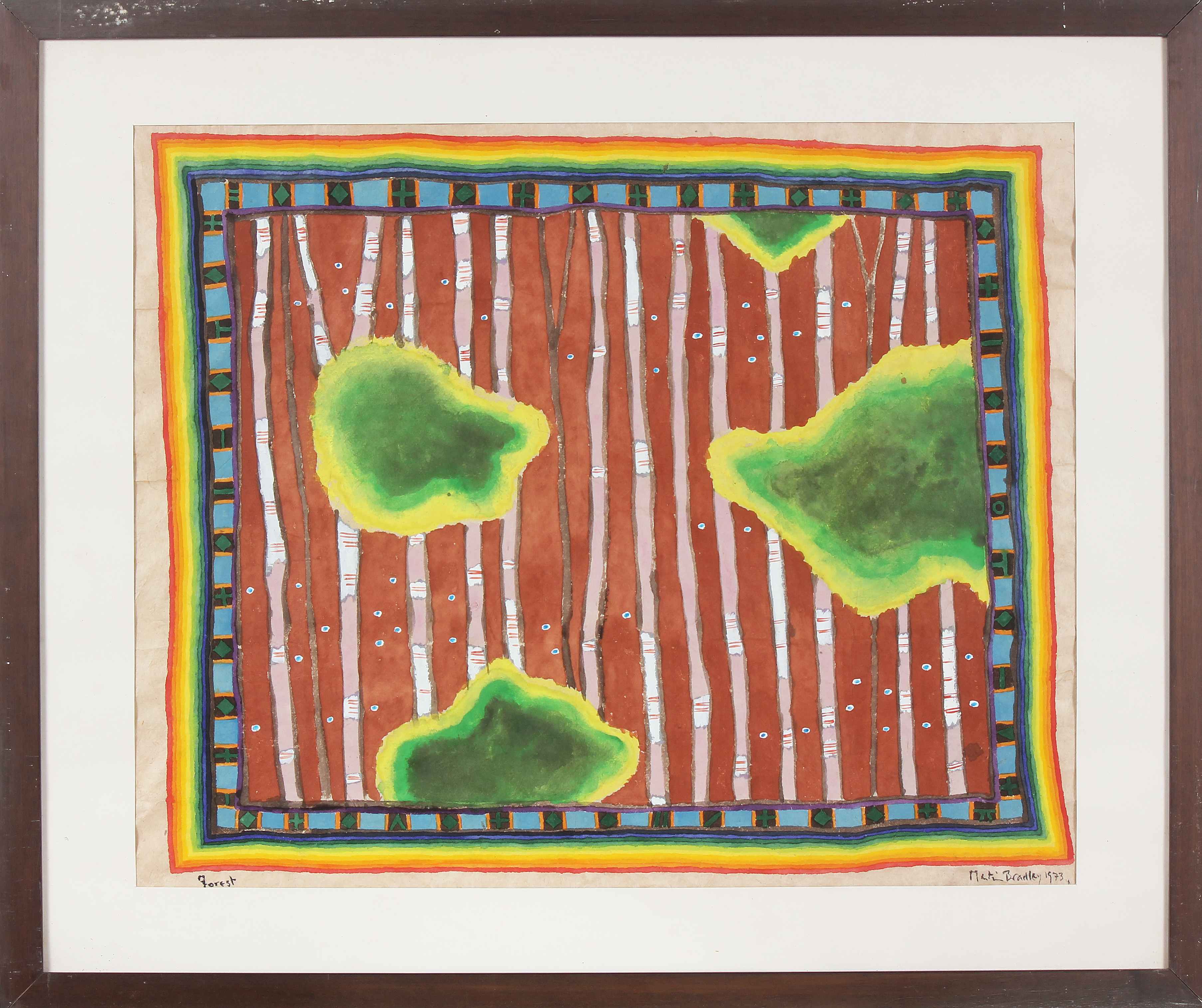BRADLEY MARTIN (n. 1931) Forest. 1973. Tecnica mista su carta. Cm 64,00 x 50,00. Titolo, firma e anno in basso. Al retro cartiglio descrittivo a cura di Beniamino Levi Arte Moderna. PROVENIENZA: EREDITA' MARCELLO FERRARI, GALLERIA FERRARI, TREVIGLIO. . Cornice presente