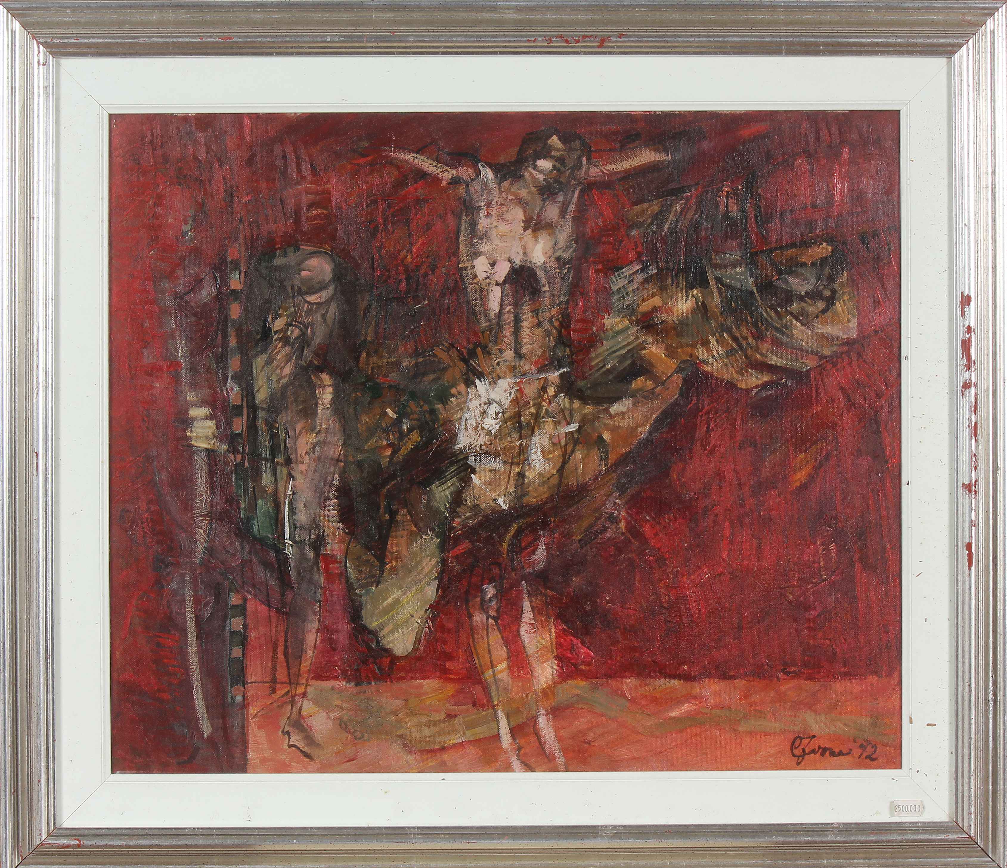 MARRA MINO (n. 1938) Cariatidi: Crocifissione. 1972. Olio su tela . Cm 60,00 x 50,00. Firma e anno in basso a destra. Al retro titolo, firma e anno. PROVENIENZA: EREDITA' MARCELLO FERRARI, GALLERIA FERRARI, TREVIGLIO. . Cornice presente