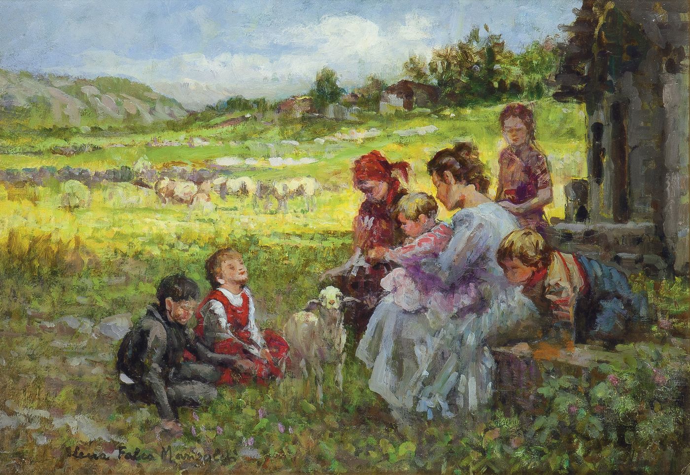 MARISALDI FALCO ELENA (Santo Stefano Belbo (CN) 1901 - 1986 Torino) - "Famiglia in campagna", 35x49,5 olio su cartone. Opera firmata in basso a sinistra