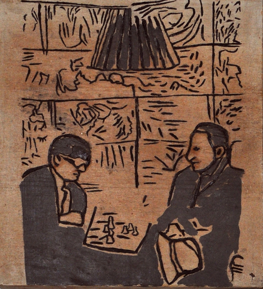 SARENCO A collection of african Dada Art, 1993/1994 Man Ray and Marcel Duchamp playing chess Tecnica mista su tavola incisa Es. 1/3 cm. 32,3x28 Firma, data, titolo e tiratura sul retro