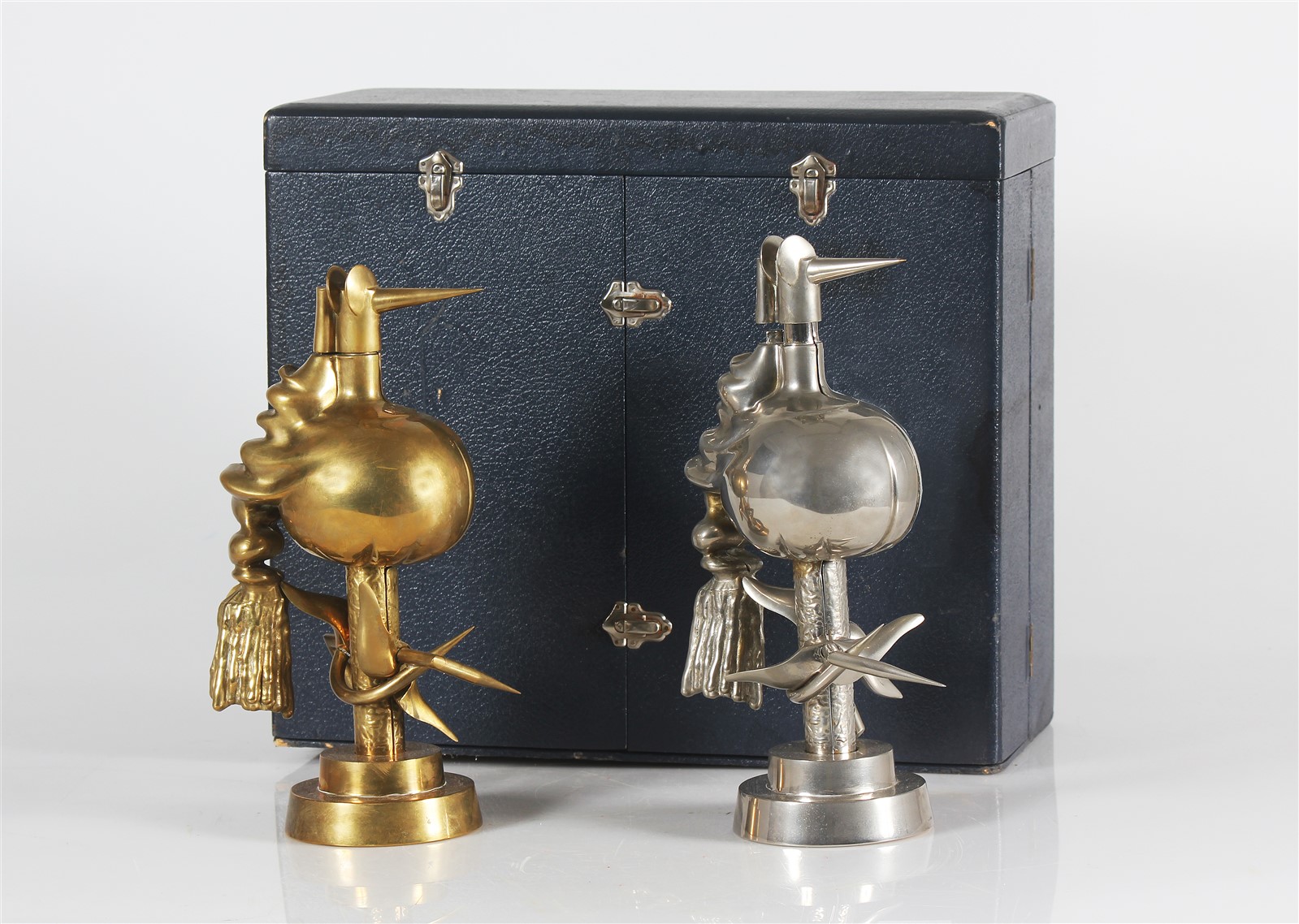 LAM WILFREDO (1902 - 1982) L'oiseau de Fer (due sculture). 1970. Metallo. Cm 14,00 x 26,00 x 9,00. 480/500A; 480/500B. Entrambe le sculture presentano firma e tiratura. Di questa opera esistono 5 prove d'artista firmate e numerate da A a E e 500 copie firmate e numerate da 1/500a a 500/500a in ottone lucidato fuse ad iniezione. Entrambe le sculture presentano il certificato di autenticità a cura Atelier Wilfredo Lam. Contenute nella scatola originale.
