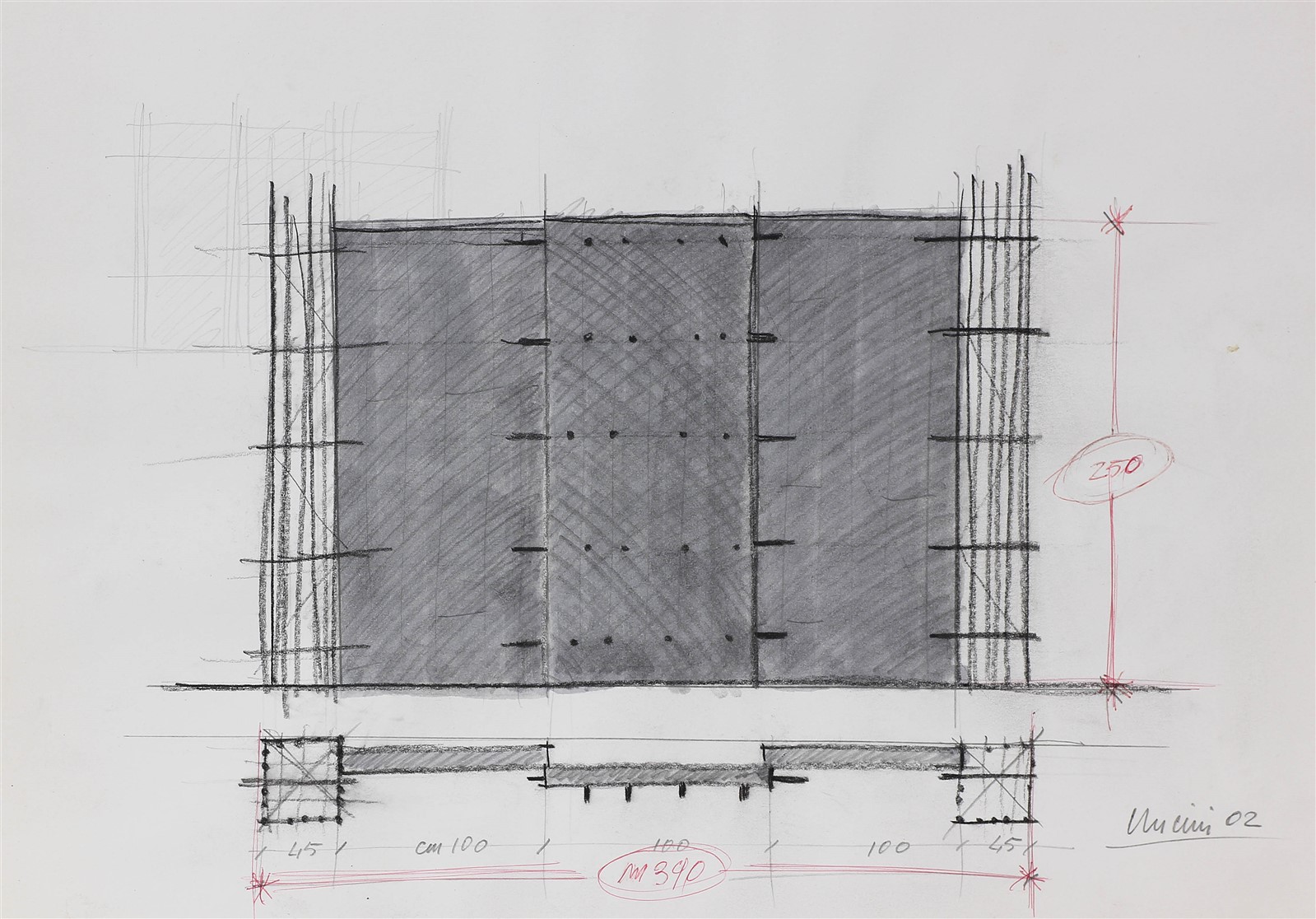 UNCINI GIUSEPPE (1929 - 2008) Progetto per muro cemento. 2002. Tecnica mista su carta. Cm 41,50 x 29,00. Firma e data in basso a destra. Autentica a cura dell'Archivio Uncini, Trevi, riportante il relativo numero d'inventario come da documentazione fotografica allegata.