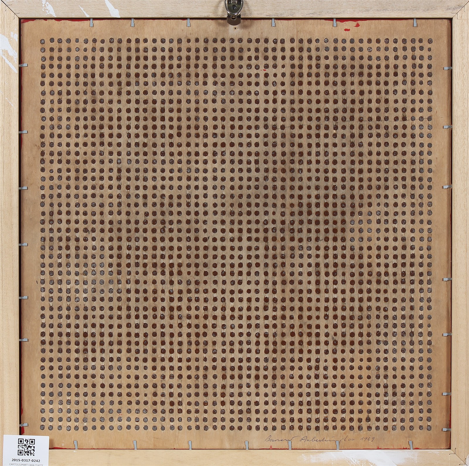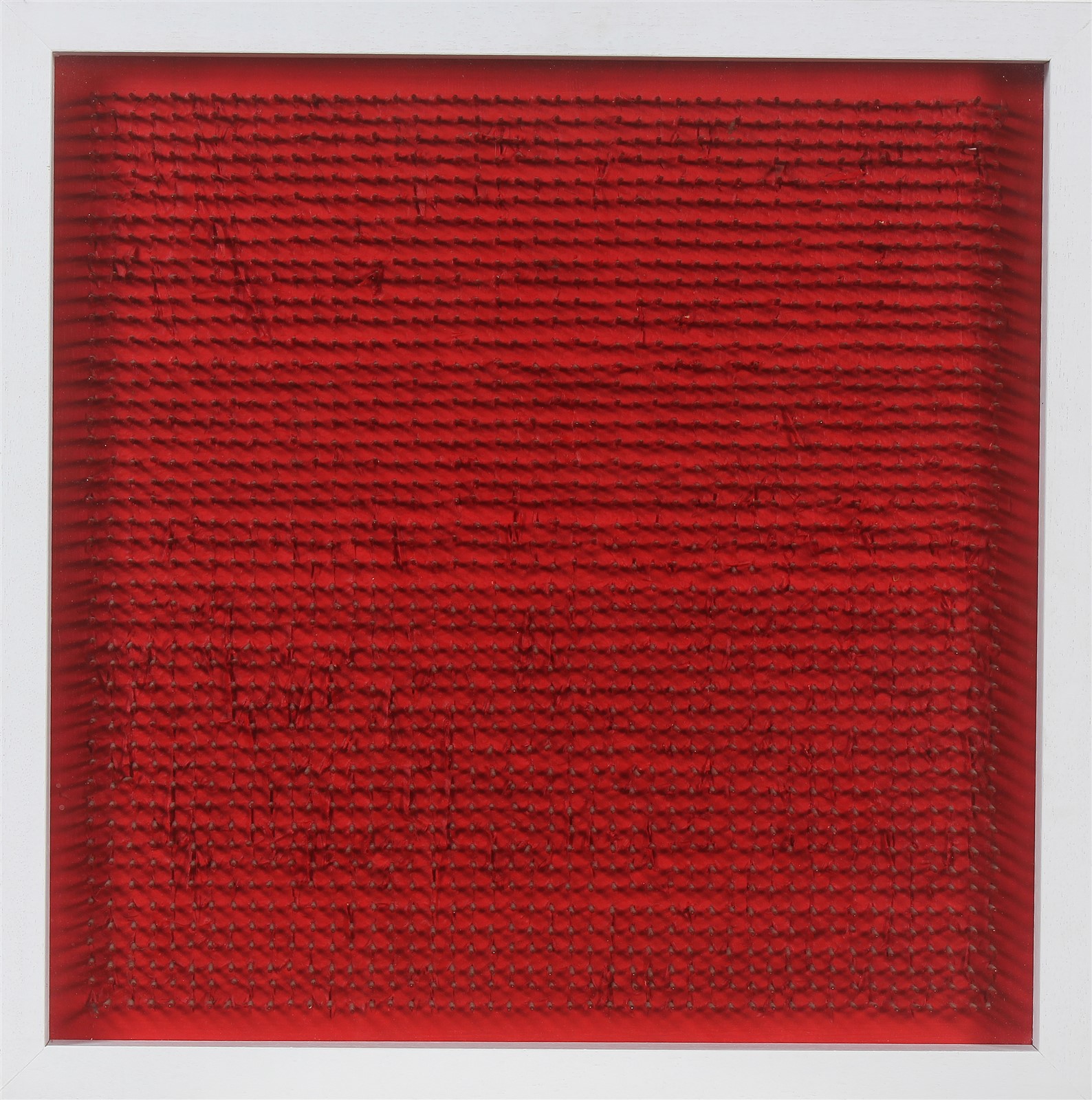 AUBERTIN BERNARD (n. 1934) Tableau Clous. 1969. Chiodi su tavola. Cm 50,00 x 50,00. Al retro firma e anno. Autentica dell'artista e timbro a secco Giancarlo Rovetta su fotografia. Provenienza: Shopping Tv. Cornice presente
