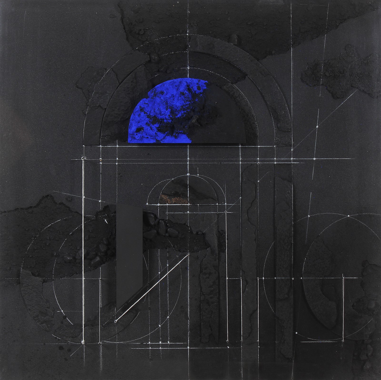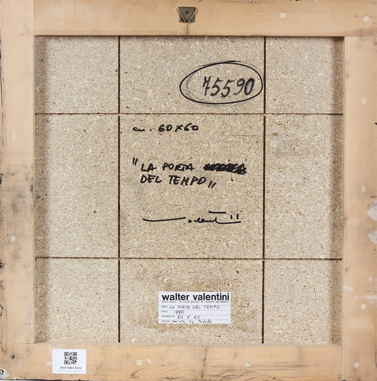 VALENTINI WALTER (n. 1928) La porta del tempo. 1990. Tecnica mista su tavola. Cm 60,00 x 60,00. Al retro titolo, firma e cartiglio descrittivo a cura dell'artista. Contenuto in una teca di plexiglass.