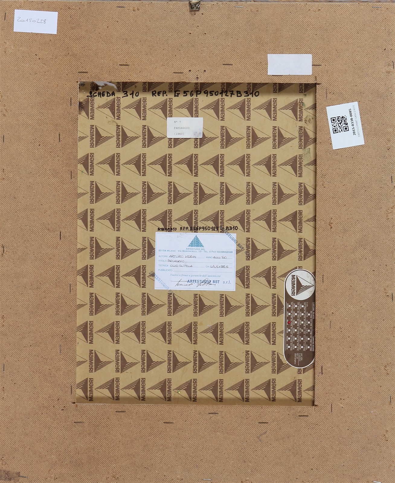 VERMI ARTURO (1928 - 1988) Paesaggio. Olio su tela . Cm 35,50 x 45,50. Prima metà anni '60. Firma in basso a destra. Al retro cartiglio descrittivo a cura di Arte Studio srl, Milano. Opera archiviata presso l'archivio delle opere di Arturo Vermi, presso Artestudio, Milano, come da documentazione fotografica allegata all'opera (copia dell'originale autenticata dall'archivio con timbro a secco) riportante il relativo numero d'inventario.