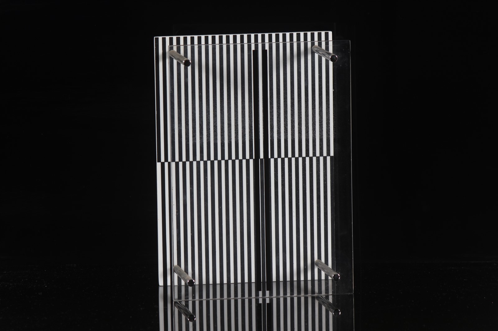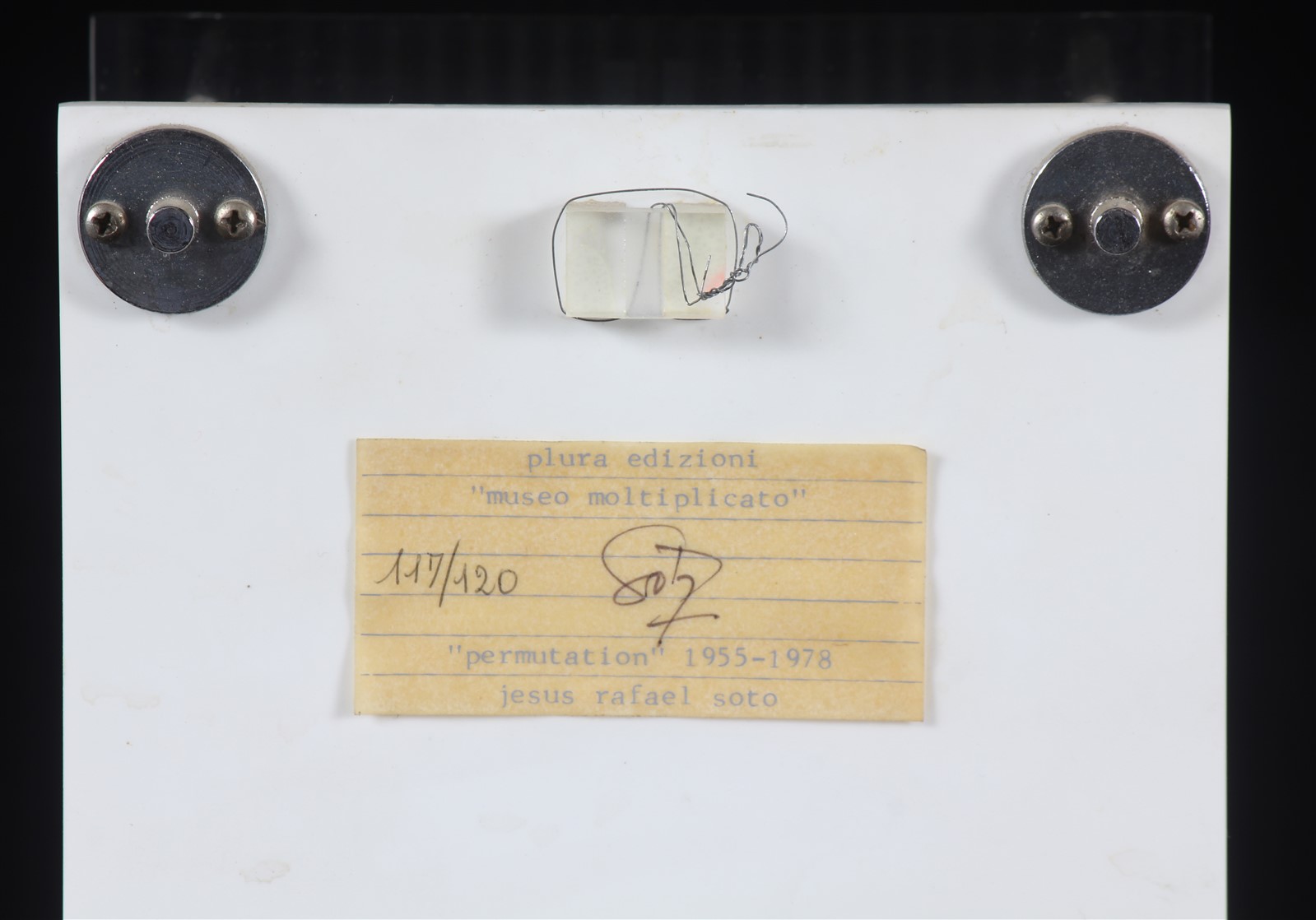 SOTO JESUS RAFAEL (1923 - 2005) Permutation. Multiplo in plexiglass serigrafato. Cm 15,00 x 21,00. 117/120. 1955 - 78. Tiratura e firma a penna sul retro. Plura edizioni, Museo moltiplicato.