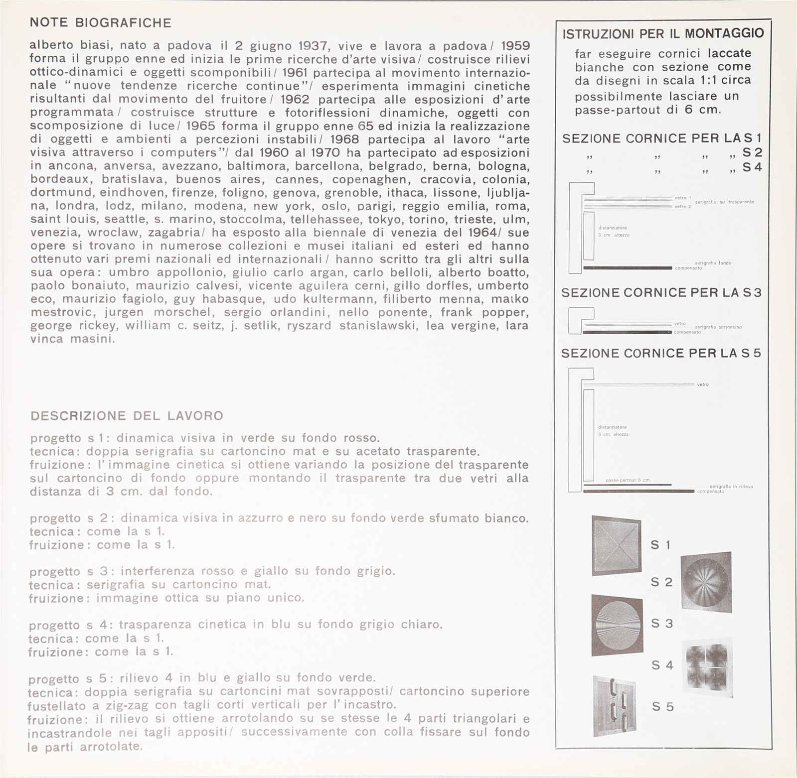 BIASI ALBERTO (n. 1937) Cinque serigrafie cinetiche di Alberto Biasi. 1970. Serigrafia (cartella completa). Cm 47,50 x 47,50. Cartella completa contenente cinque serigrafie originali a colori di cui tre con supporto doppio e una in rilievo. Edizione 100 + X. Presente colophon con istruzioni per il montaggio. Descrizione dei singoli lavori: progetto S1, dinamica visiva in verde su fondo rosso, doppia serigrafia su cartoncino mat e su acetato trasparente. Progetto S2, dinamica visiva in azzurro e nero su verde sfumato bianco, doppia serigrafia su cartoncino mat e su acetato trasparente. Progetto S3, interferenza rosso e giallo su Sfondo grigio, serigrafia su cartoncino mat. Progetto S4, trasparenza cinetica in blu su fondo grigio chiaro, doppia serigrafia su cartoncino mat e su acetato trasparente. Progetto S5, rilievo 4 in blu e giallo su fondo verde, doppia serigrafia su cartoncino mat sovrapposti, cartoncino superiore fustellato a zig zag con tagli corti verticali per l'incastro. Giuseppe Strano Editore, Padova. Ogni serigrafia presenta tiratura, titolo, firma e anno in basso a matita. Esemplare: 94.