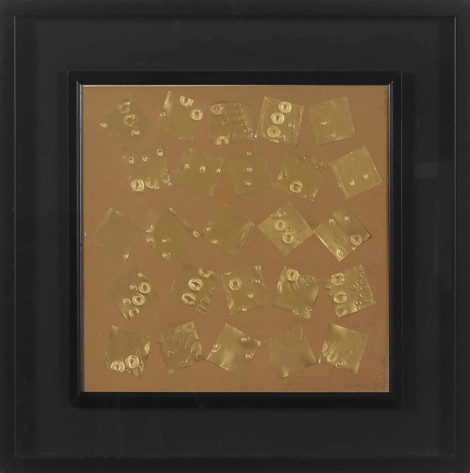 CAMPESAN SARA (n. 1924) Senza titolo. 1985. Tecnica mista su tavola. Cm 35,00 x 35,00. Titolo non decifrato, firma e anno in basso a destra. Autentica dell'artista su fotografia con timbro a cura della Galleria d'Arte Contemporanea, Mestre - Venezia. Cornice presente