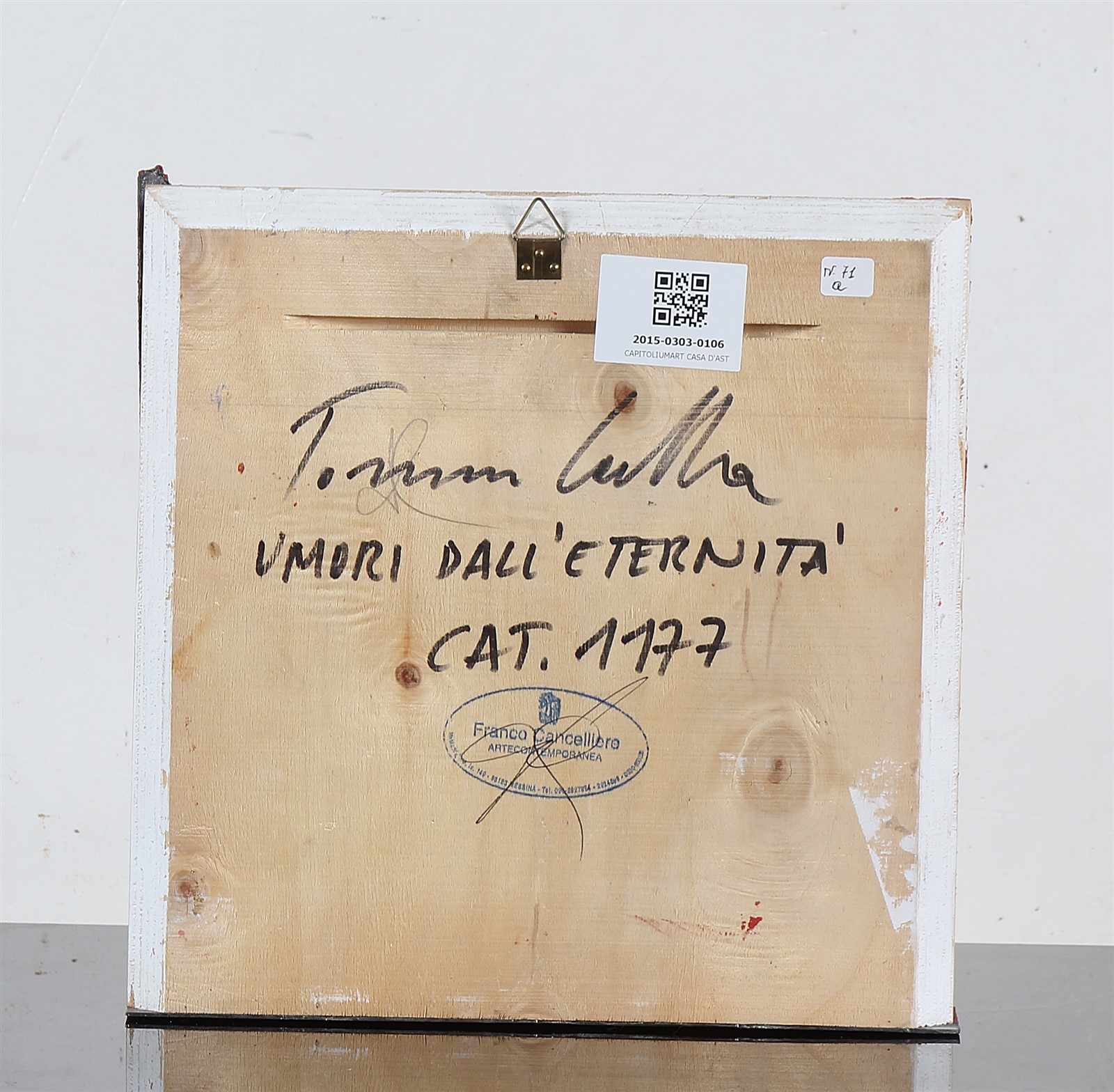 CASCELLA TOMMASO (n. 1951) Umori dall'eternità. 1997. Acrilico, legno e ferro. Cm 30,00 x 30,00. Al retro firma, titolo e timbro a cura di Franco Cancelliere Arte Contemporanea, Messina. Autentica dell'artista su fotografia.