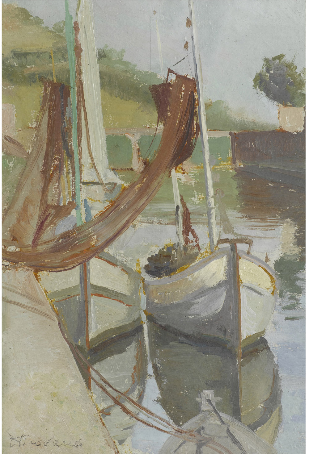 Ernesto Pirovano (1901-1972) Barche ormeggiate Olio su cartoncino Firmato Misure 27.5x18.5 cm
