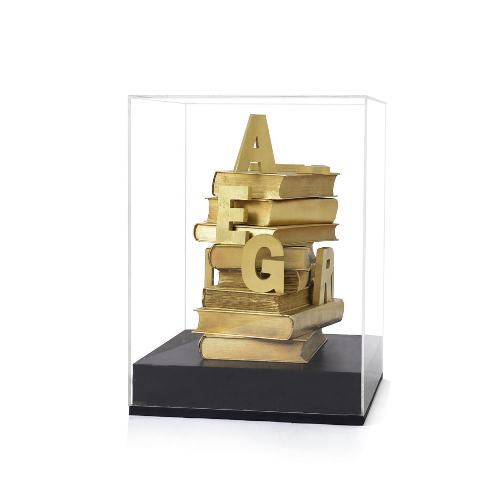 scultura, acrilici dorati e assemblaggio di libri e lettere in legno cm. 49x35x31, poggiante su base in legno cm. 60x46x46, opera non firmata, dichiarazione d'autenticità dell'artista su foto, protetta da teca in plexiglass.
