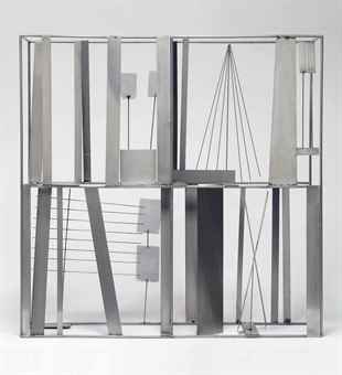 FAUSTO MELOTTI (1901-1986) Contrappunto II acciaio inox cm 100x100x21,5 Realizzata nel 1970 c. in 3 esemplari + 1 prova d’artista; esemplare 2/3 P R O V E N I E N Z A : Galleria Annunciata, Torino Collezione privata, Milano ivi acquisita dall’attuale proprietario nel 1991 E S P O S I Z I O N I : Torino, Galleria Galatea, Fausto Melotti, 2-29 marzo 1971, cat., p. 6 (illustrata, datata 1969) Dortmund, Museum am Ostwall, Fausto Melotti, 31 ottobre - 19 dicembre 1971, cat., n. 51 Torino, Galleria Civica d’Arte Moderna, Melotti, 26 maggio - 23 luglio 1972, cat. n. 63, n. 48 (illustrata, anche sulla copertina del catalogo, datata 1970) Zurigo, Marlborough Gallery, Fausto Melotti, marzo - aprile 1973; poi Roma, Marlborough Gallery, maggio - giugno 1973, cat., n. 23 Bolzano, Galleria d’arte Il Sole, Melotti, 6 aprile - 2 maggio 1974, cat. Imperia, Pinacoteca Civica, 1 Biennale d’Arte “Città di Imperia”, 13 aprile - 18 maggio 1975, cat., n. 132 Parma, Università di Parma, Sala delle Scuderie in Pilotta, Fausto Melotti, 1976, cat. Trento, Castello del Buonconsiglio, Fausto Melotti. Opere 1935-1977, 22 maggio - 20 luglio 1977, cat., n. 14 (altro esemplare illustrato, datata 1969) Milano, Palazzo Reale, Melotti, 16 maggio - 17 giugno 1979, cat., p. 40, n. 36 (altro esemplare illustrato, datata 1969) Sermoneta, Castello Caetani, 20’ Festival Pontino di Musica 1984. Fausto Melotti, 13 - 27 giugno 1984, cat., n. 1 Lisbona, Centro de Arte Moderna, Fondazione Calouste Gulbenkian, Primeira Exposicao - Dialgo sobra a Arte Contemporanea en Europa, 28 marzo - 16 giugno 1985, cat., p. 275 Desenzano del Garda, Galleria Civica Palazzo Todeschini, Melotti. Sculture e disegni, aprile - maggio 1989, cat., p. 25 B I B L I O G R A F I A : “Tuttosport”, anno XXVIII, n. 148, 30 maggio 1972 “L’Unità”, 10 giugno 1972 “D’Ars”, n. 61-62, novembre - dicembre 1972, p. 242 “Domus”, n. 517, dicembre 12, 1972, p. 51 “Futurismo-oggi”, novembre - dicembre 1974, p. 3 “Cahiers Européens”, n. 3/75, luglio 1975, p. 35 “Qui Arte Contemporanea”, n. 16, marzo 1976, p. 14 “Terzo occhio”, a. VII, n. 21, settembre 1981, p. 12 “Temporale”, n. 6, settembre 1984, p. 7 G. Celant, Melotti Catalogo Generale, Milano 1994, vol. I, p. 239, n. 1969 45 (altro esemplare illustrato)