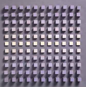 DADAMAINO (1930-2004) Cromorilievo firmato e datato Dada 15.IV.1975 (sul retro) tasselli di legno dipinto su tavola cm 49,5x49,5x5,5 Eseguito nel 1975 Opera registrata presso l’Archivio Generale dei Dipinti di Dadamaino, n. 093/14, come da autentica su fotografia in data 23 maggio 2014 P R O V E N I E N Z A : Donato dall’artista dall’attuale proprietario nel 1975