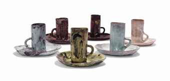 FAUSTO MELOTTI (1901-1986) Servizio da caffè siglata con monogramma (sotto la base di ogni elemento) ceramica smaltata policroma diametro cm 12 (ogni piatto) altezza cm 8,5 (ogni tazzina) Realizzata nel 1955 c. Opera registrata presso l’Archivio Fausto Melotti, Milano, n. KF 025, come da autentica su fotografia in data 3 marzo 2015 P R O V E N I E N Z A : Dono dell’artista alla famiglia dell’attuale proprietario