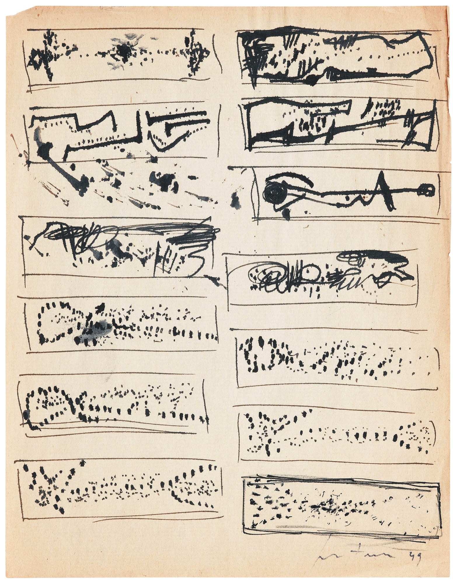 Lucio Fontana 1899 - 1968 STUDIO PER DECORAZIONE ARCHITETTONICA INK ON PAPER. EXECUTED IN 1952 china su carta cm 28x22 Eseguito nel 1952 READ CONDITION REPORT AUTHENTICATION Opera registrata presso la Fondazione Lucio Fontana, Milano, con il n. 1900/259 L'opera è accompagnata da certificato su fotografia rilasciato dalla Fondazione Lucio Fontana, Milano CATALOGUE NOTE Studio per rilievi dell'edificio di Via Lanzone 6 a Milano