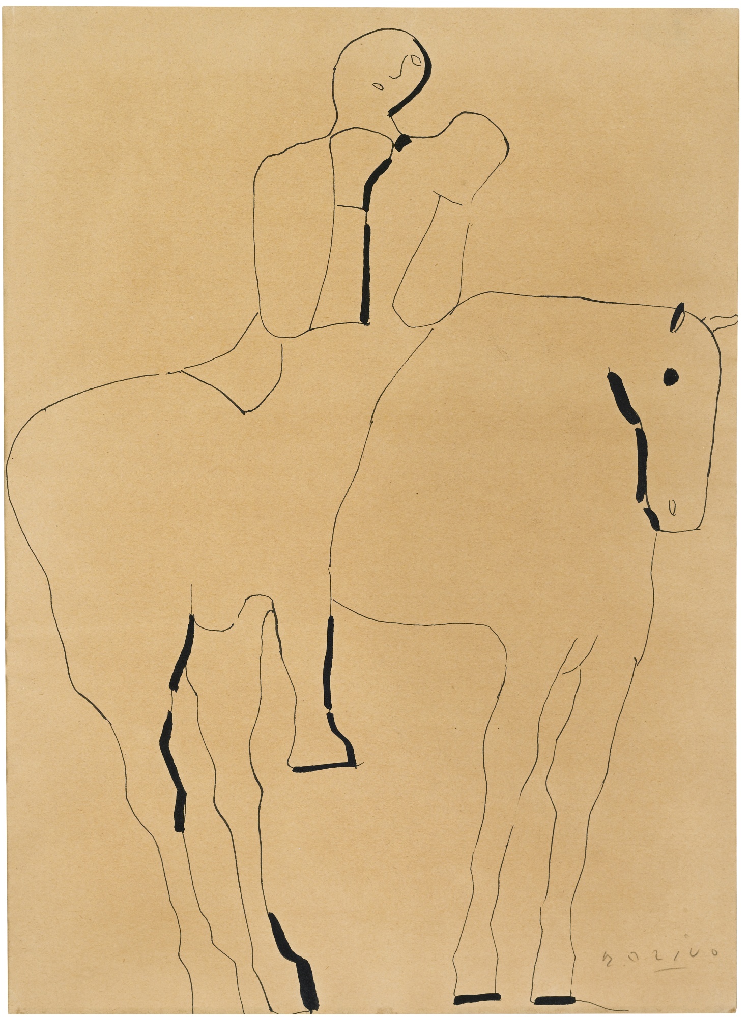 Marino Marini 1901 - 1980 CAVALLO E CAVALIERE SIGNED, INK ON PAPER. EXECUTED IN THE FORTIES firmato china su carta cm 34,5x25 Eseguito negli anni Quaranta READ CONDITION REPORT AUTHENTICATION Opera registrata presso la Fondazione Marino Marini, Pistoia, con il n. 686 L'opera è accompagnata da certificato su fotografia rilasciato dalla Fondazione Marino Marini, Pistoia PROVENANCE Arthur Kauffmann, Londra Collezione Rossdale, Londra Ivi acquistato dall'attuale proprietario nel 1998