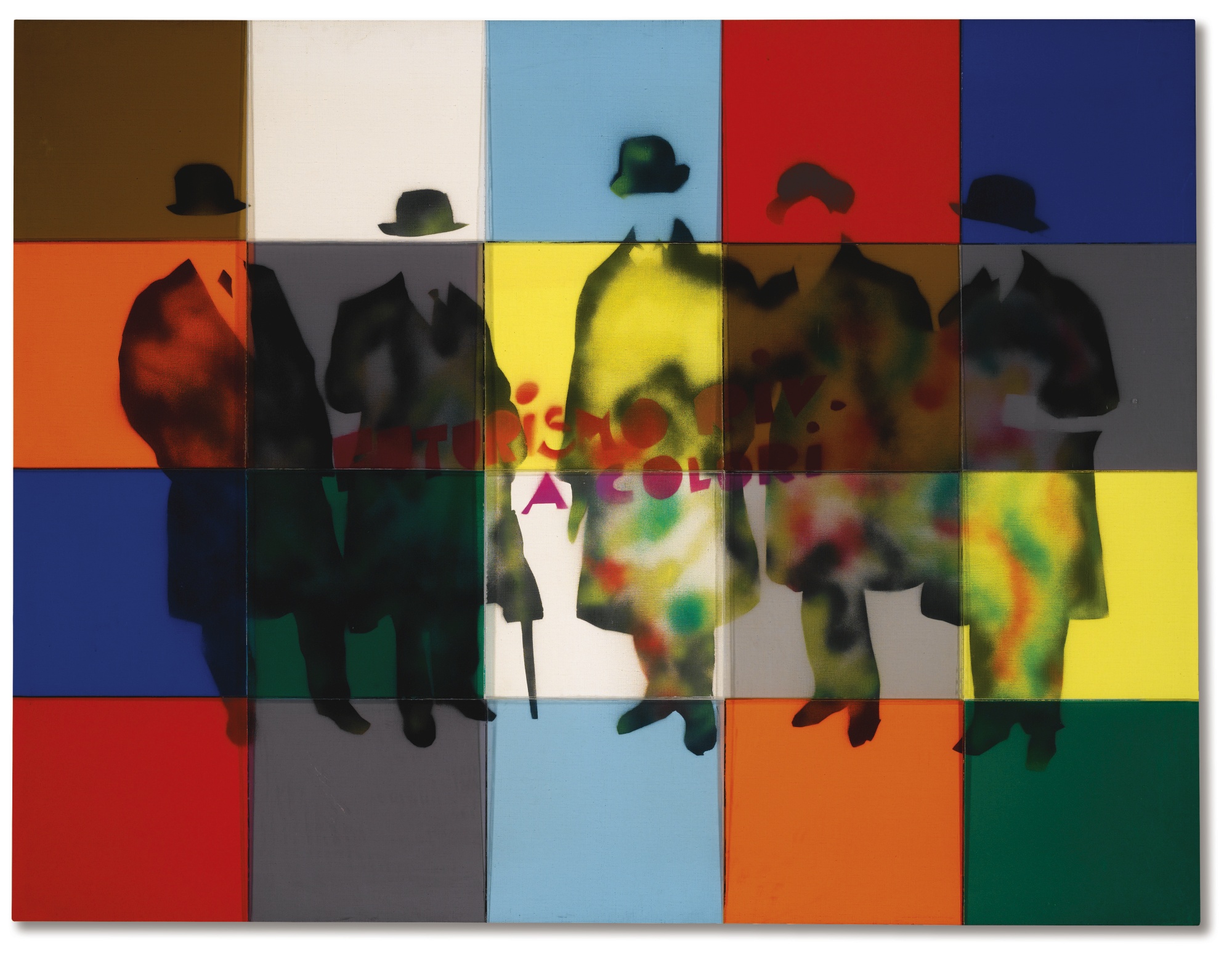 Mario Schifano 1934 - 1998 FUTURISMO RIVISITATO A COLORI SIGNED ON THE REVERSE, SPRAY ON CANVAS AND COLOURED PLEXIGLAS. EXECUTED IN THE LATE SEVENTIES firmato sul retro spray su tela e plexiglass colorati cm 132,5x172,5 Eseguito nella seconda metà degli anni Settanta READ CONDITION REPORT SALEROOM NOTICE AUTHENTICATION Opera registrata presso la Fondazione Mario Schifano, Roma, con il n. SM70/303 Opera accompagnata da certificato su fotografia rilasciato dalla Fondazione Mario Schifano, Roma, in data 3 luglio 2000