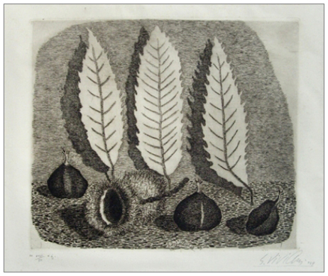 GIUSEPPE VIVIANI Agnano Pisano 1898 – Pisa 1965 Castagne e foglie 1949 Acquaforte su rame es.XXVI/50. Firma e data in b. a d., titolo sul verso. (25,3 x 35,3 foglio – 20 x 24 inc.) Pubbl.: “Viviani Opera Incisoria Catalogo Generale” a cura di Nicola Micieli e Silvio Guarasci, Bandecchi e Vivaldi Editore, Pontedera, 1998, n.102 + p.195. B.A.: 500