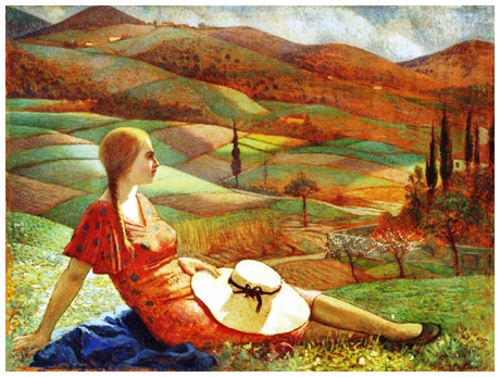 LANDO LANDOZZI Pisa 1887 – Livorno 1959 Fanciulla con cappello di paglia sulle colline livornesi Olio su tavola 103,3 x 138,2. Firma in a. a d. Prov.: raccolta Gastone Razzaguta, Livorno. Opera esposta alla mostra “Omaggio a Landozzi (1887 – 1959) dal grottesco alla caricatura” a cura di Francesca Cagianelli, Pinacoteca Servolini, Collesalvetti, 18 luglio – 8 agosto 2013. B.A.: 2.000